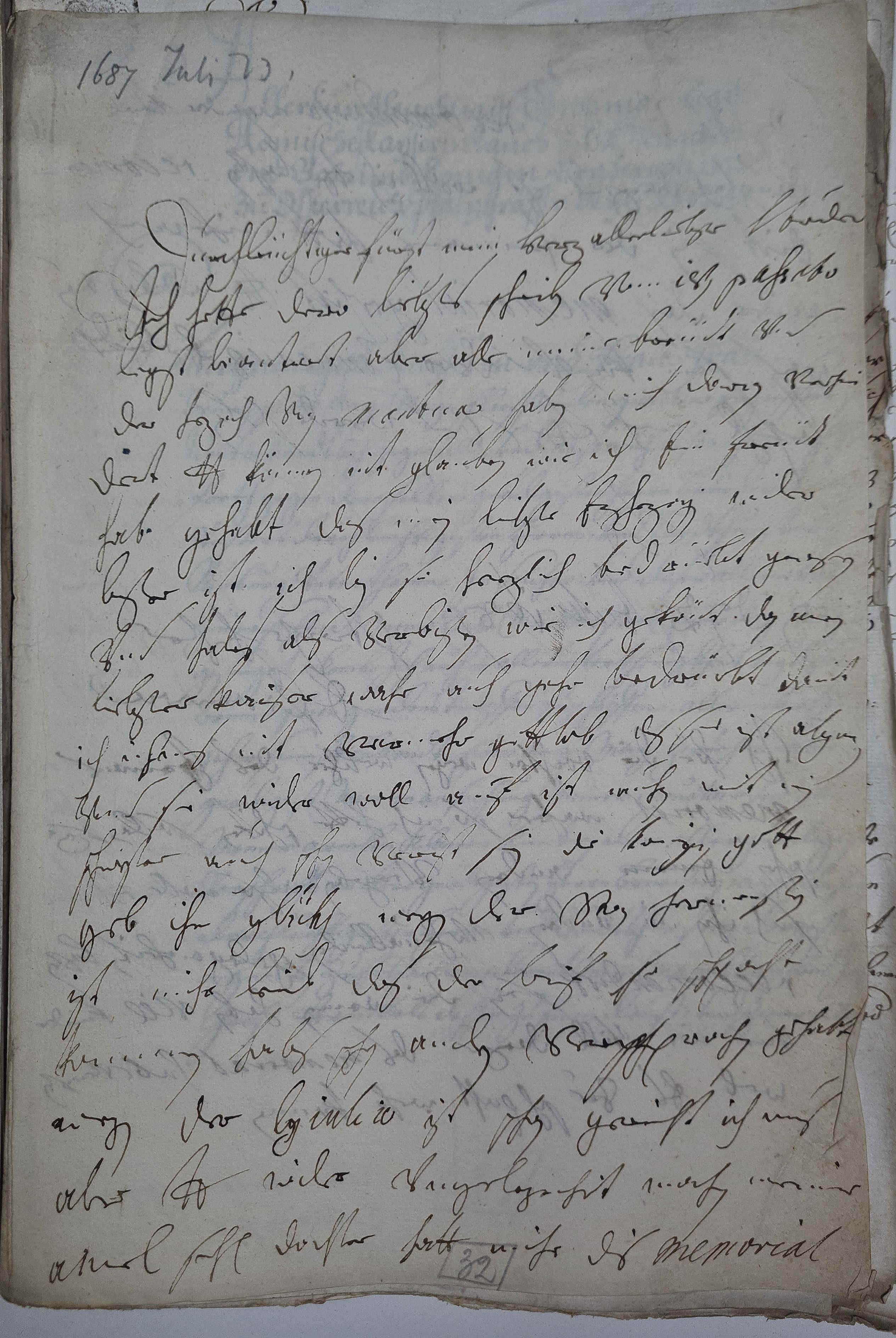 0019geschikt, dero Liebden zu recomendirn, wan der kerl 0020dauglich darzue ist, woll ihn dero Liebden laßen recomen- 0021dirt sein. Der Irmans hatt mihr auch 0022wider das memorial geschikt, dero Liebden wollen duen, 0023was sein kan vnd dero conuenienz erleidt. 0024Befehl mich dero Liebden vnd werde sterben 0025dero Liebden 0026getrewste schwester 0027Eleonora 0028Wien den 2ten julii 16870029Ich hör, die vochtei, wegen welcher des Irmans 0030memorial wahre, so ich hette schiken sollen, sey 0031schon einem andren vergeben, also wolle dero Liebden 0032sich ihn in andren vohruallenden gelegenheiten laßen 0033reccomendirt sein. Die armen haben vill kinder 0034vnd nit vill dazue, das memorial hab verißen, 0035weil es zue schapht wehr kommen.