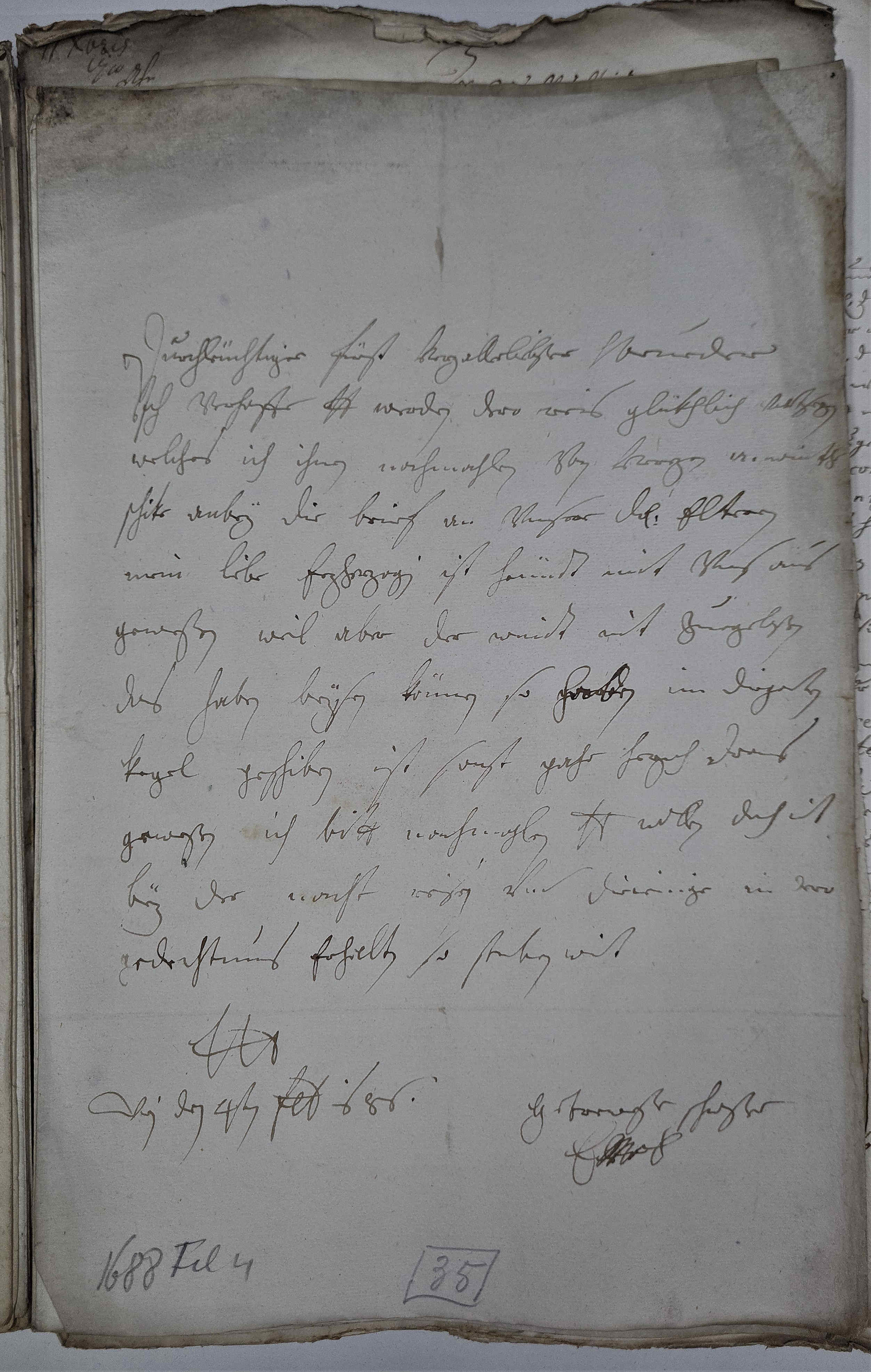 0001Durchleüchtiger Fürst, herzallerlibster herr brueder 0002Ich verhoffe, dero Liebden werden dero reis glükhlich vortsezen, 0003welches ich ihnen nochmahlen von herzen anwüntsch. 0004Schike anbey die brief an vnsere durchlauchtigen eltern . 0005Meine libe Erzherzogin ist heündt mit vns aus 0006geweßen, weil aber der windt nit zuegelaßen, 0007das haben beysen können, so haben im dirgarten 0008kegel geschiben, ist sonst gahr herzich draus 0009geweßen. Ich bitt nachmahlen, dero Liebden wollen doch nit 0010bey der nacht reisen und dieienige in dero 0011gedechtnus erhalten, so sterben wirt 0012dero Liebden 0013getreweste schwester 0014EMT 0015Wien den 4ten februarii 1686