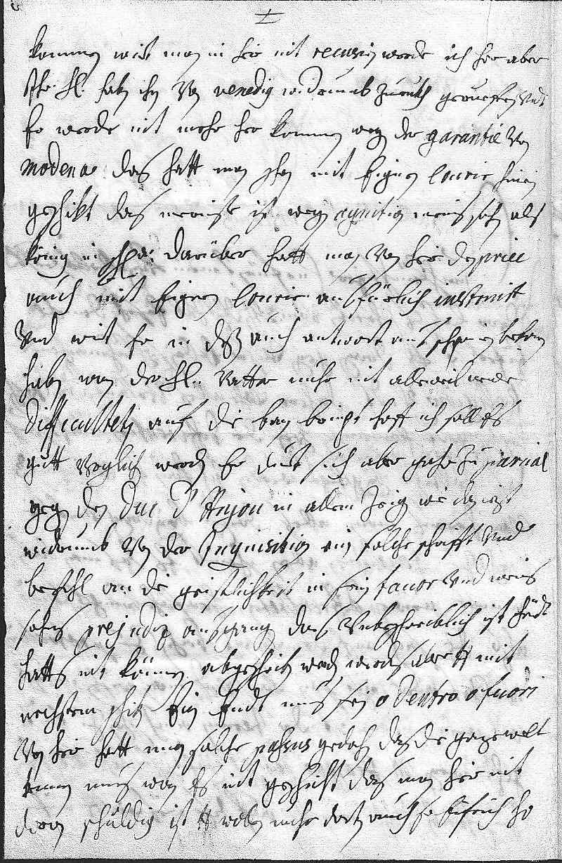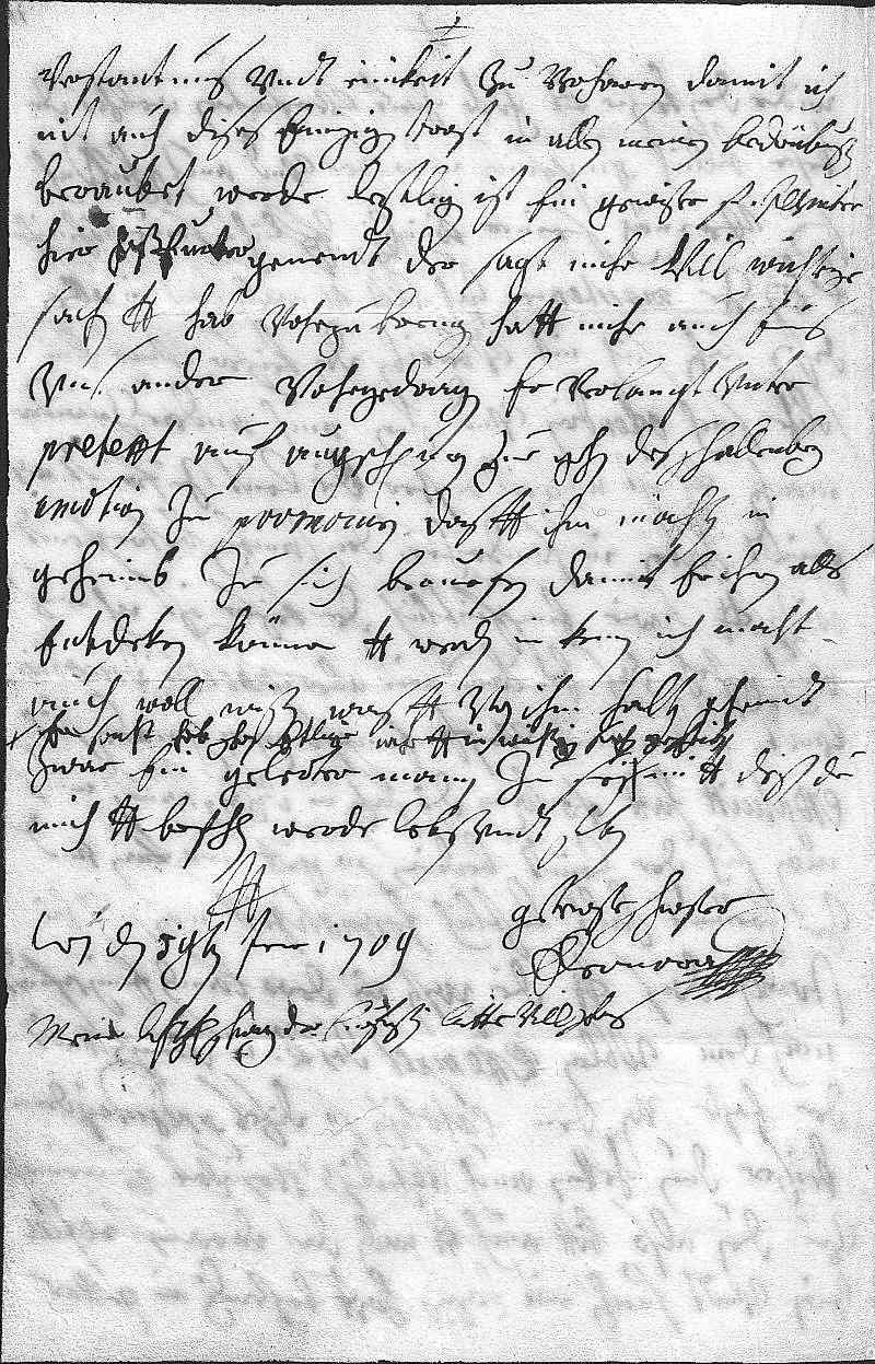 0098verstantnus vndt einikeit zu verharren, damit ich 0099nit auch dises einzigen trost in allen meinen bedrübnußen 0100beraubet werde. Leztligen ist ein gewißer Pater jesuiter 0101hier, Hoßlunder genendt, der sagt mihr vill wichtige 0102sachen, die ich dero Liebden hab vohrzubrengen, hatt mihr auch eins 0103vnd ander vohrgedragen. Er verlangt vnter 0104pretext auf Augschpurg zue gehn, des Schallenberg 0105emotion zu promouiren, und das dero Liebden ihm möchten in 0106geheimb zu sich beruefen, damit er ihnen alls 0107entdeken können, dero Liebden werden in kenen. Ich mocht 0108auch woll wißen, was dero Liebden von ihm halten, scheindt 0109zwar ein gelerter mann zu sein, er sacht, er hab schon etlige iahr dero Liebden in wichtigen sachen geschriben. Mitt disen due 0110mich dero Liebden befehlen, werde leben vndt sterben 0111dero Liebden 0112getrewste schwester 0113Eleonora 0114Wien den 19ten jener 1709 0115Meiner liebsten fraw schwägerin, der Curfurstin, bitte vill schons zu sagen.