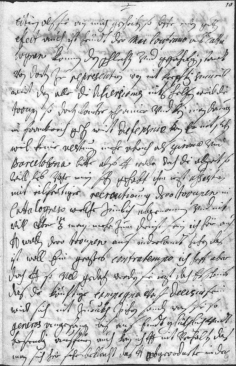 0035licitiren, als sie an mich geschriben, so hoffe einen gutten 0036effect. Auch ist heündt der Marchese Lonfrano aus Catta- 0037lognen kommen, den schlechten vnd gefahrligen standt 0038von dorten zu representiren, wan nit krefftig sucurirt 0039wirt, dan alle die diuersionen niks helfen, weil die 0040troupen, so dorten, lauter schpanier vnd kein man daruon 0041in Frankreich gehn wirt. Defensiue kan er nit stehn, 0042weil keine vestung mehr vbrich als Girona vnd 0043Barcelolona. Bitte also, dero Liebden wollen doch, die allzeit so 0044vill lieb vohr mein sohn gehabt, ihm iezt assistirn 0045mit eilfertiger recroutirung dero troupen in 0046Cattalognen, welche zimlich abgenommen vnd nit 0047vill über 3000 man mehr zum dienst sein. Ich hör auch, 0048dero Liebden wollen dero troupen aus Niderlandt zihen, das 0049ist woll ein großes contratempo. Ich hoff aber, 0050dah dero Liebden so vill gedahn, werden sie iezt, dah es scheinet, 0051das die könftige campagna vast decisiu sein 0052wirt, sich nit zurukh zihen, sondern was sie so 0053generos angefangen bis ans endt glükhlich vndt 0054bestendig ausfüren. Auch kan ich dero Liebden nit verhalten, das 0055man sich hier sehr beklacht, das dero Liebden abgeordnete in der