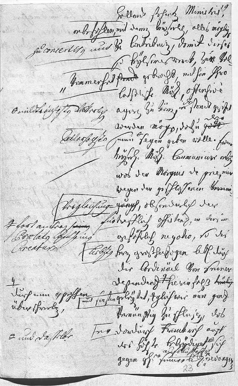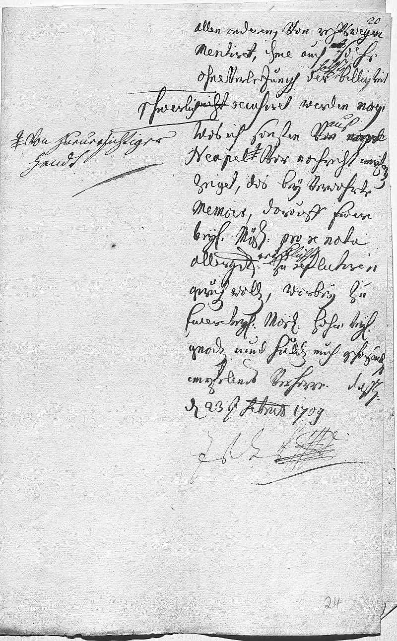 Freut sich über die Einigung zwischen dem päpstlichen und dem kaiserlichen Hof und den kaiserlichen Entschluss, zusätzliche Truppen nach Spanien zu schicken. – Hat seinen Ministern in England und Holland befohlen, alle mögliche Unterstützung mit der kaiserlichen Seite abzustimmen, damit der spanische KönigKarl) in die Offensive gehen kann. – Der Großherzog (von Toskana) hat die Verhandlungen des Marquis de Prié über die von ihm abhängigen Kardinäle und Prälaten unterstützt und bedarf gegen die Revanche Frankreichs umso mehr der kaiserlichen Protektion. – Sendet beiliegend ein Memoire aus Neapel.