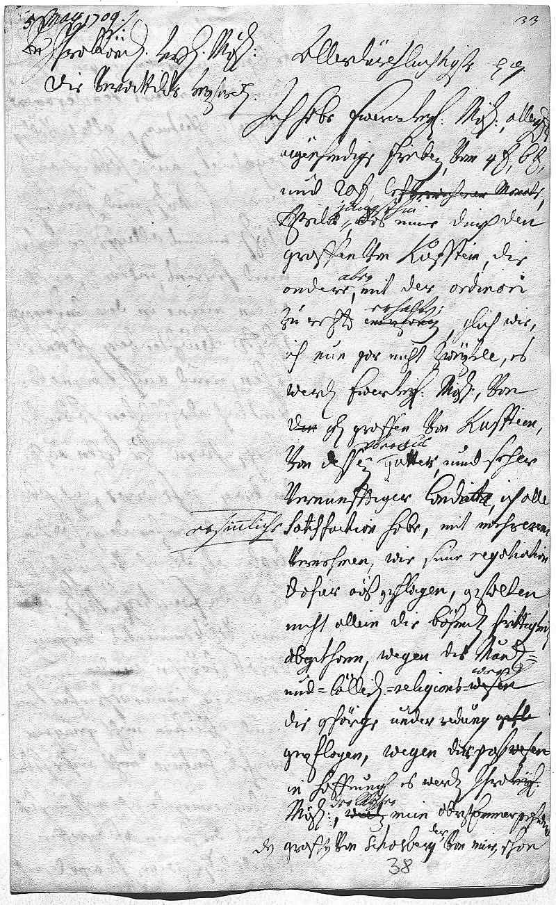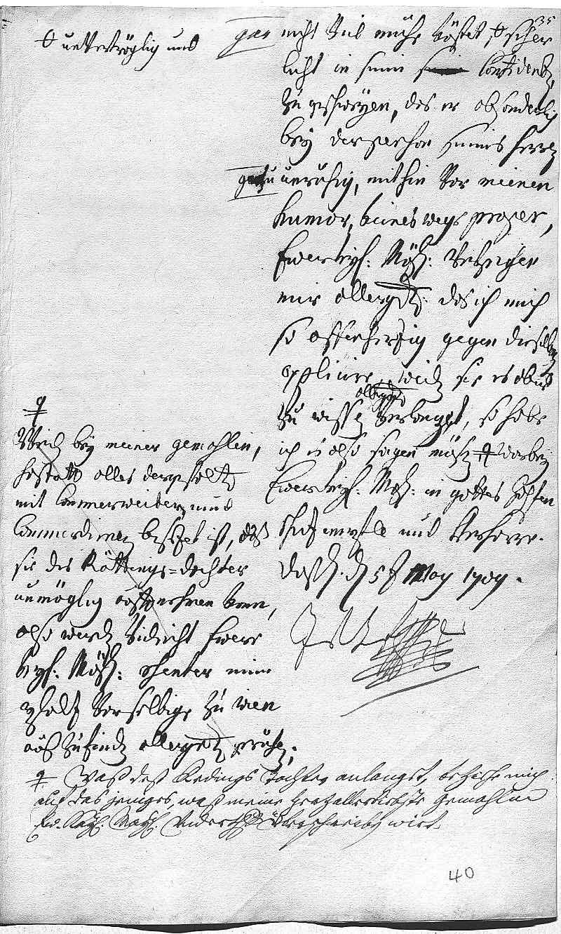 Graf Kuefstein wird EMT von seinen Verhandlungen mit JW berichten. Die böhmischen Streitigkeiten sind beigelegt. Hofft, dass sein Kammerpräsident Graf Schaesberg , der von ihm schon als Erbpostmeister belehnt wurde, vom Kaiser entschädigt wird. Hat sich entschlossen, seine Lehen und Rechte in der Grafschaft Leuchtenberg Lamberg zu Lehen aufzutragen. – Wird EMTs Gedanken wegen seines Bruders, Pfalzgraf Karl (Philipp) und Neapel noch beantworten. – Der Papst muss erkennen, wie sehr EMT sich die Aufrechterhaltung des Vergleichs (zwischen Papst und Kaiser) angelegen sein lässt. – Im Vertrauen gesagt, könnte man sich in Wien damit begnügen, den Hoch- und Deutschmeister (Bruder Franz Ludwig) beim letzten mal um Münster gebracht zu haben; ein Bischof von Münster kann im Notfall ebenso gut heiraten wie ein Bischof von Worms. – Hat tatsächlich kein sonderliches Vertrauen mehr zum Grafen Wiser und hat ihn nur in Erinnerung an die treuen Dienste seines Vaters so lange in seiner Funktion belassen; er ist unbesonnen, argwöhnisch und hochmütig. – Bezieht sich wegen der Tochter des Redings auf den Brief seiner Gemahlin an EMT.