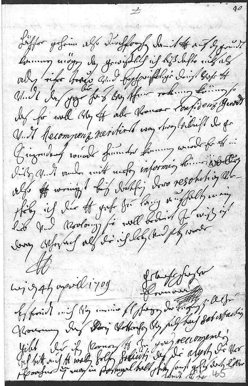 0160höchster geheim also durchforschen, damit dero Liebden auf den grundt 0161kommen mögen, dan gewißlich ich biß dahto niks als 0162allen eifer, trew vnd erschprislige dienst vohr dero Liebden 0163vndt das ganze cur haus von ihme erkennen können, so 0164das er woll von dero Liebden alle vernere confidenz, gnadt 0165vndt recompenz meritiret. Wan etwan villeicht der Grav 0166Sinzendorf wurde hinunter kommen, wurde er dero Liebden in 0167dißen vndt andren mitt mehren informiren können, wollen 0168also dero Liebden wenigst bis dorthin dero resolution ver- 0169schiben. Ich due dero Liebden gahr zu lang aufhalten, mein 0170lieb vnd verlangen, sie woll bedinet zu wißen, ist 0171doran vhrsach, als die ich leben vnd sterben werde 0172dero Liebden 0173getrewste schwester 0174Eleonora 0175Wien den 4ten aprill 1709 0176Es freüdt mich, von meiner fraw schwegerin, der Curfurstin Liebden, zu 0177vernemmen, das mein vetterchen von Sulsbach satisfaction 0178gibt, due ihn verners dero Liebden zu gnaden reccomendiren. 0179Ich bitt auch, dero Liebden wollen helfen solicitirn, das die alijrten die ver- 0180schprochne 7000 man in Portugal balt schiken, sonst gehts dorten über 0181vndt über.