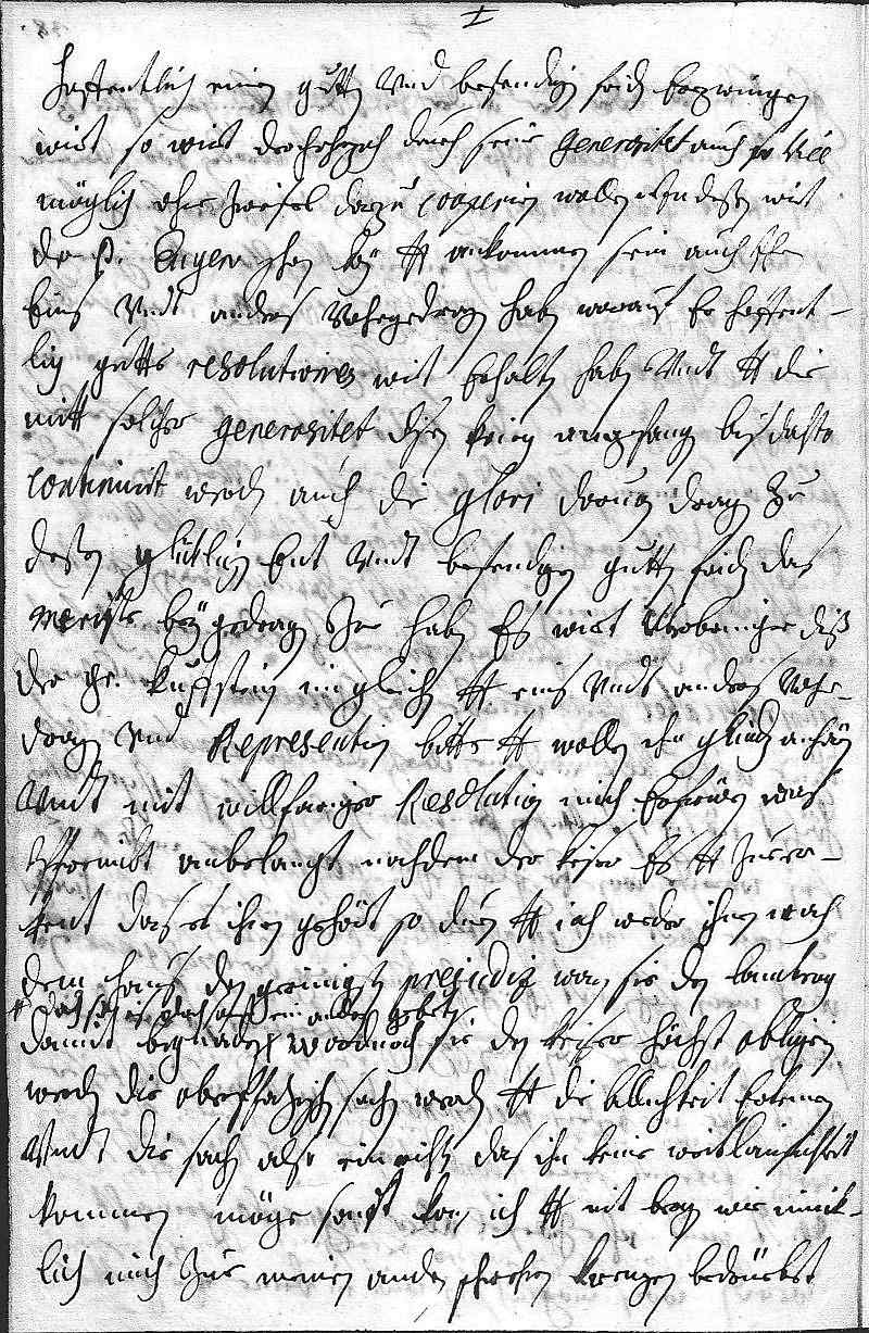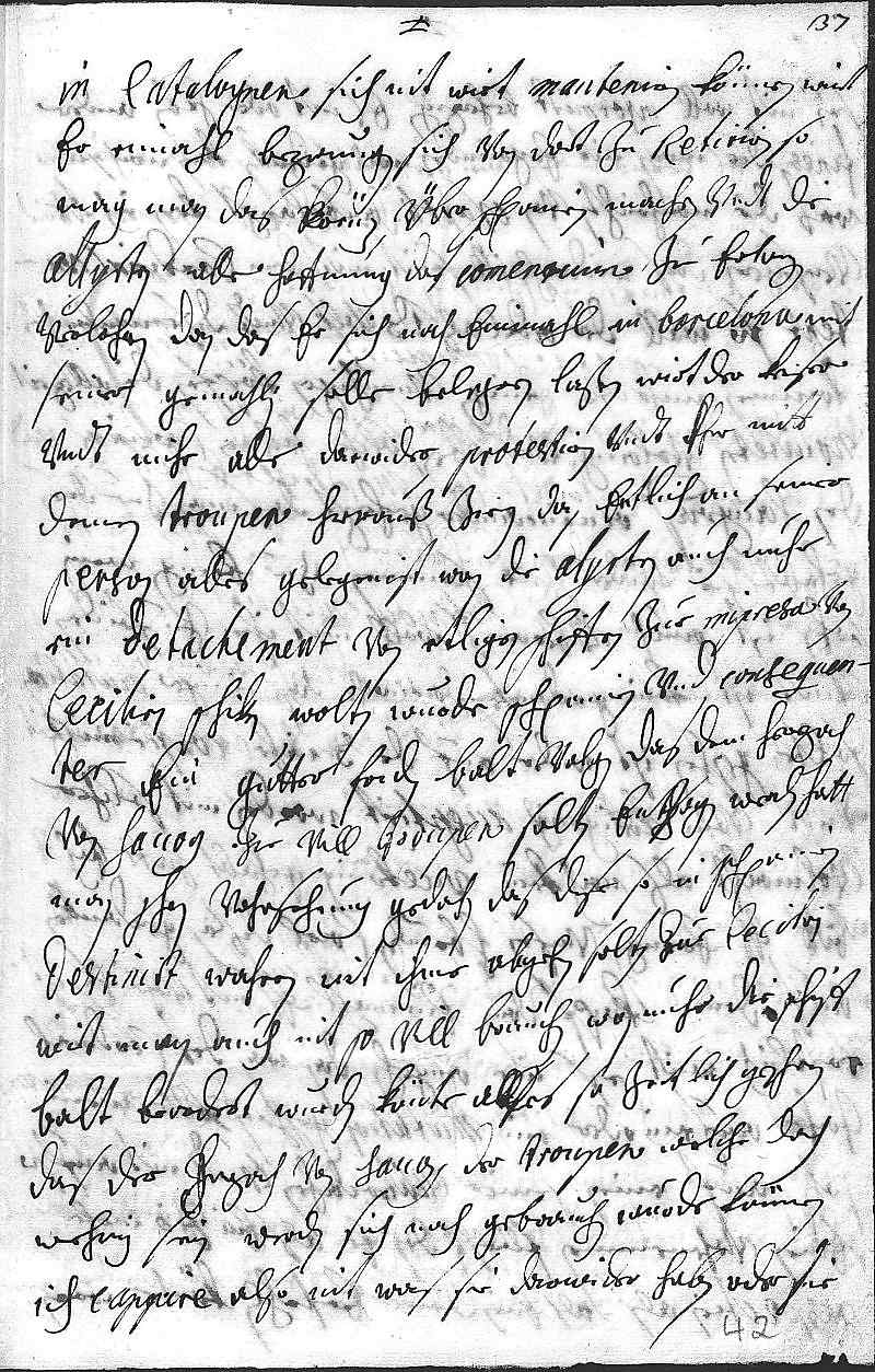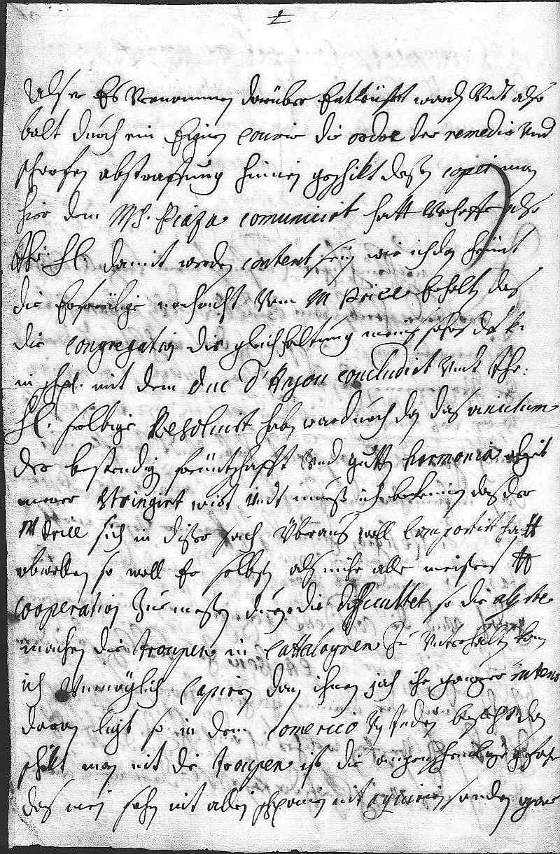 0015als er es vernommen, darüber entrüstet worden vndt also 0016balt durch ein eignen courir die ordre der remedir vnd 0017scharfen abstraffung hinnein geschikt, deßen copei man 0018hier dem Monsignore Piaza comunicirt hatt. Verhoffe also, das0019ihr Heiligkeit damit werden content sein, wie ich dan heünt 0020die erfreülige nachricht vom Marchese Priee erhalten, das 0021die congregation die gleichhaltung meins sohns, des Königs 0022in Schpanien, mit dem Duc d' Anjou concludirt vndt ihr 0023Heiligkeit selbige resoluirt haben, wardurch dan das anulum 0024der bestendigen freüntschafft vnd gutten harmonia alzeit 0025merer stringirt wirt. Vndt mueß ich bekennen, das der 0026Marchese Priee sich in dißer sach überaus wohl comportirt hatt, 0027obwollen so woll er selbsten als mihr alle meistes dero Liebden 0028cooperation zue meßen duen. Die difficultet, so die alijrten 0029machen, die troupen in Cattalognen zu vnterhalten, kann 0030ich vnmöglich capiren, dan ihnen jah ihr ganzer intent 0031daran ligt, so in dem comercio von Indien besteht, dan 0032schikt man nit die troupen, ist die augenscheinlige gefahr, 0033das mein sohn nit allein Schpanien nit aquiren, sondern gar