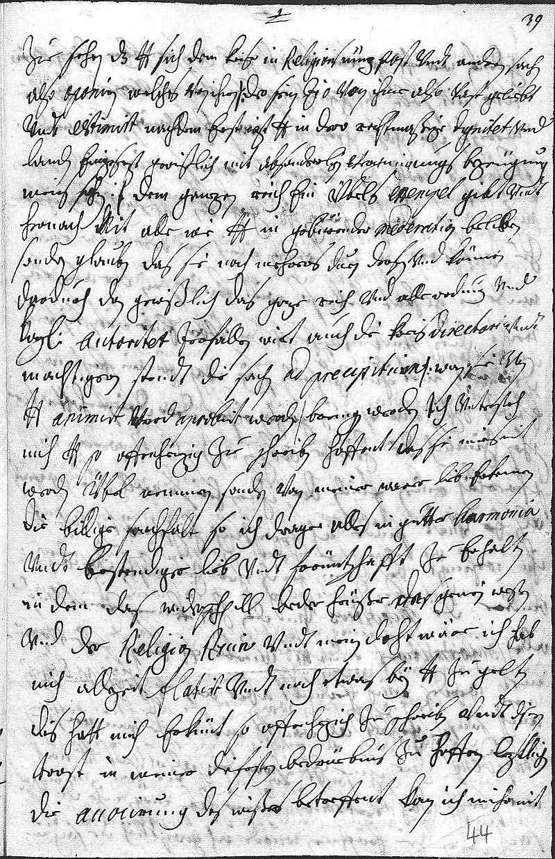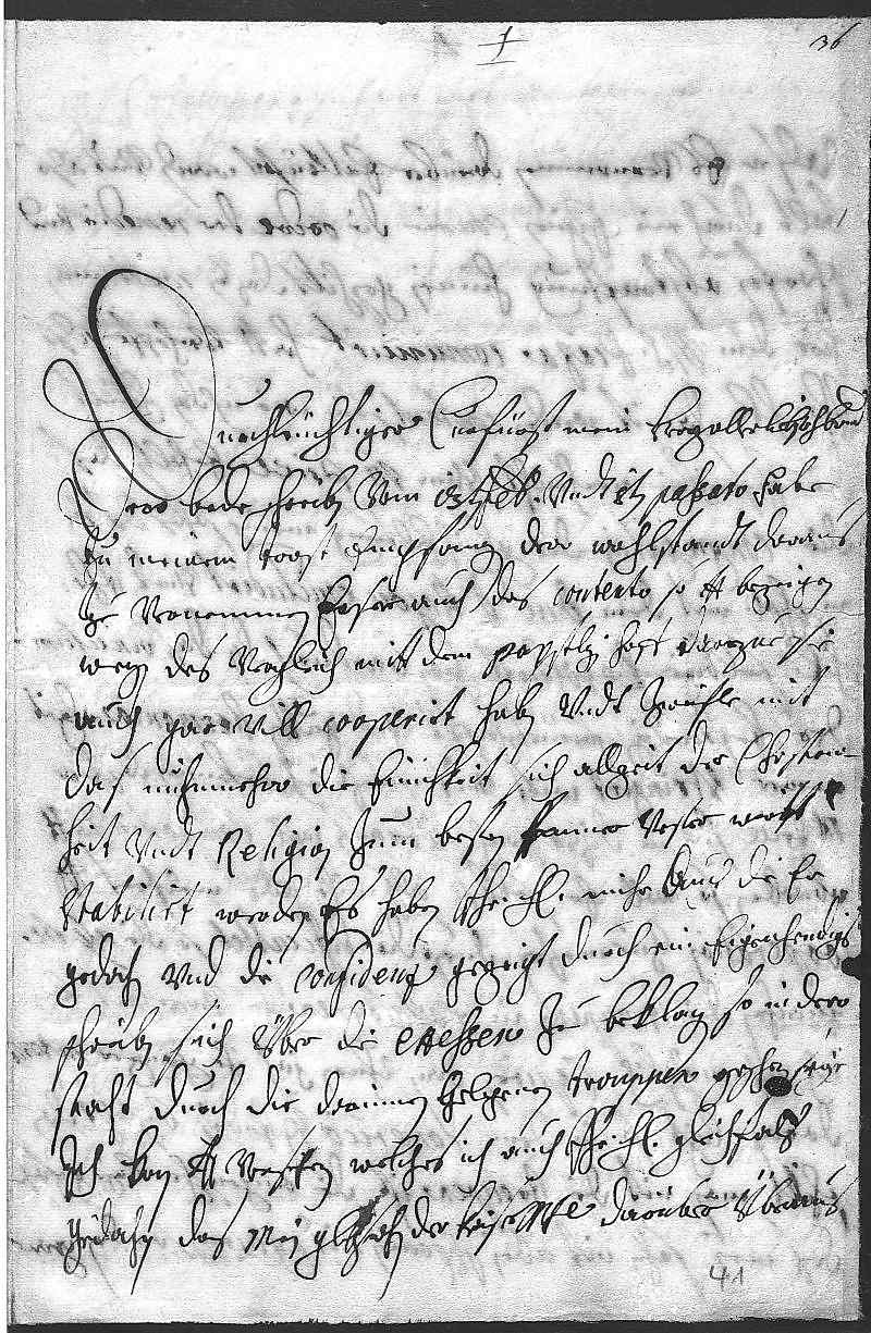 0118zue sehen, das dero Liebden sich dem Keiser in religions, münz, post vndt andren sachen 0119also oponiren, welches von ihnen (der sein zio, von ihme also vast geliebt 0120vndt estimirt, nachdem erst iezt dero Liebden in dero rechtmaßige dignitet vnd 0121landen eingesezt, gewißlich mit absonderligen vergnügungs bezeügnung 0122meins sohn) dem ganzen Reich ein übels exempel gibt vndt 0123hernach nit alle, wie dero Liebden, in gebürender mederation beliben, 0124sondern glauben, das sie noch mehrers duen derfen vnd können, 0125dardurch dan gewißlich das ganze Reich vnd alle ordung vnd 0126kayserliche autoritet zerfallen wirt, auch die kreisdirectori vndt 0127machtigeren stendt die sachen ad precipitium (wan sie von 0128dero Liebden animirt vnd aprobirt werden) brengen werden. Ich vntersteh 0129mich, dero Liebden so offenherzig zue schreiben, hoffent, das sie mirs nit 0130werden übel nemmen, sondern von meiner warer lieb erkennen 0131die billige sorchfalt, so ich drage, alles in gutter harmonia 0132vndt bestendiger lieb vndt freüntschafft zu erhalten, 0133in dem das widerschpill beder heüßer, das gemein weßen 0134vnd der religion ruin vndt mein doht wäre. Ich hab 0135mich allezeit flatirt, vndt noch, etwas bey dero Liebden zu gelten, 0136dis hatt mich erkünt, so offenherzich zu schreiben vndt disen 0137trost in meiner diefesten bedrüebnus zu hoffen. Leztlichen 0138die auocirung des Wißers betreffent, kan ich mihr nit