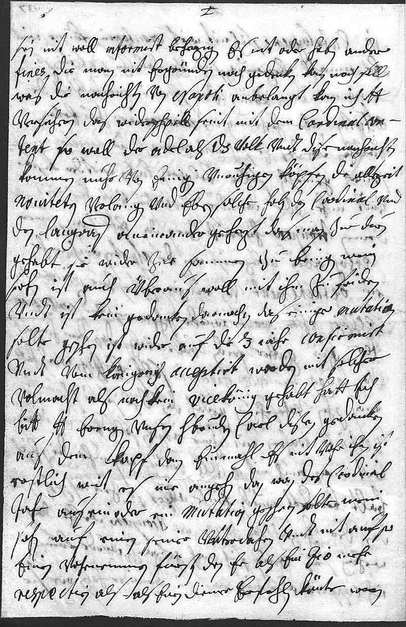 0054sein nit woll informirt, beherzigen es nit oder haben ander 0055fines, die man nit ergründen noch gedenken kann noch soll. 0056Was die nachrichten von Napoli anbelangt, kann ich dero Liebden 0057versichern das widerschpill, seint mit dem Cardinal con- 0058tent, so woll der adel als das volk, vndt dise nachrichten 0059kommen nuhr von einigen vnruhigen köpfen, die allzeit 0060nouiteten verlangen, vnd eben solche haben den Cardinal vnd 0061den Langraf aneinander gehezt, das man zue duen 0062gehabt, sie wider zue sammen zu bringen. Mein 0063sohn ist auch überaus woll mit ihm zu friden, 0064vndt ist kein gedanken darnachen, das einige mutation 0065solte geschen, ist wider auf die 3 iahr confirmirt 0066vndt vom Konigreich accepitirt worden mit solcher 0067volmacht, als noch kein Vicekönig gehabt hatt. Ich 0068bitt, dero Liebden brengen vnsern herrn bruder Carl dißen gedanken 0069auf dem kopf, dan einmahl es nit vohr ihn ist. 0070Erstlich wirt es nie angehen, dan wan des Cardinal 0071jahr ausein oder ein mutation gescheen solte, mein 0072sohn auf einen seiner vnterdahenen vndt nit auf so 0073einen vohrnemmen Fürsten, den er als ein zio mehr 0074respectirn als als einen diener befehlen könte, wan