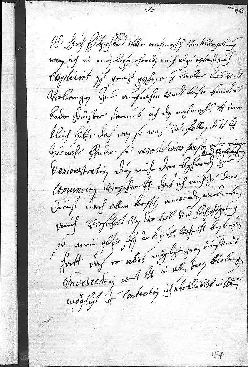 0015Postscriptum Auch, herzlibster herr bruder, bitte nochmahlen vmb vergebung, 0016wan ich in mein lezten schreiben mich alzu offenherzich 0017explicirt. Ist gewis geschen aus lautter lieb vndt 0018verlangen zue aufnahm vndt bester einikeit 0019beder haüßer. Darumb ich dan nochmahlen dero Liebden inni- 0020klich bitte, das wan so was vohrfallen duet, dero Liebden 0021zueuohr, ehnder sie resolutiones faßen oder einige 0022demonstration duen, mihr dero beschwerden vnd verlangen zue 0023comuniciren. Versicher dero Liebden, das ich mich zu dero 0024dienst nach allen krefften anwenden werde, bin 0025auch versichert von der lieb vnd hochschäzung, 0026so mein geliebster sohn, der Keiser Mayestät, vohr dero Liebden bestendig 0027hatt, das er alles möglige gern duen vndt 0028condescendirn wirt, dero Liebden in allen deren verlangen 0029möglist zu contentirn. Ich aber bleib vt in literis.