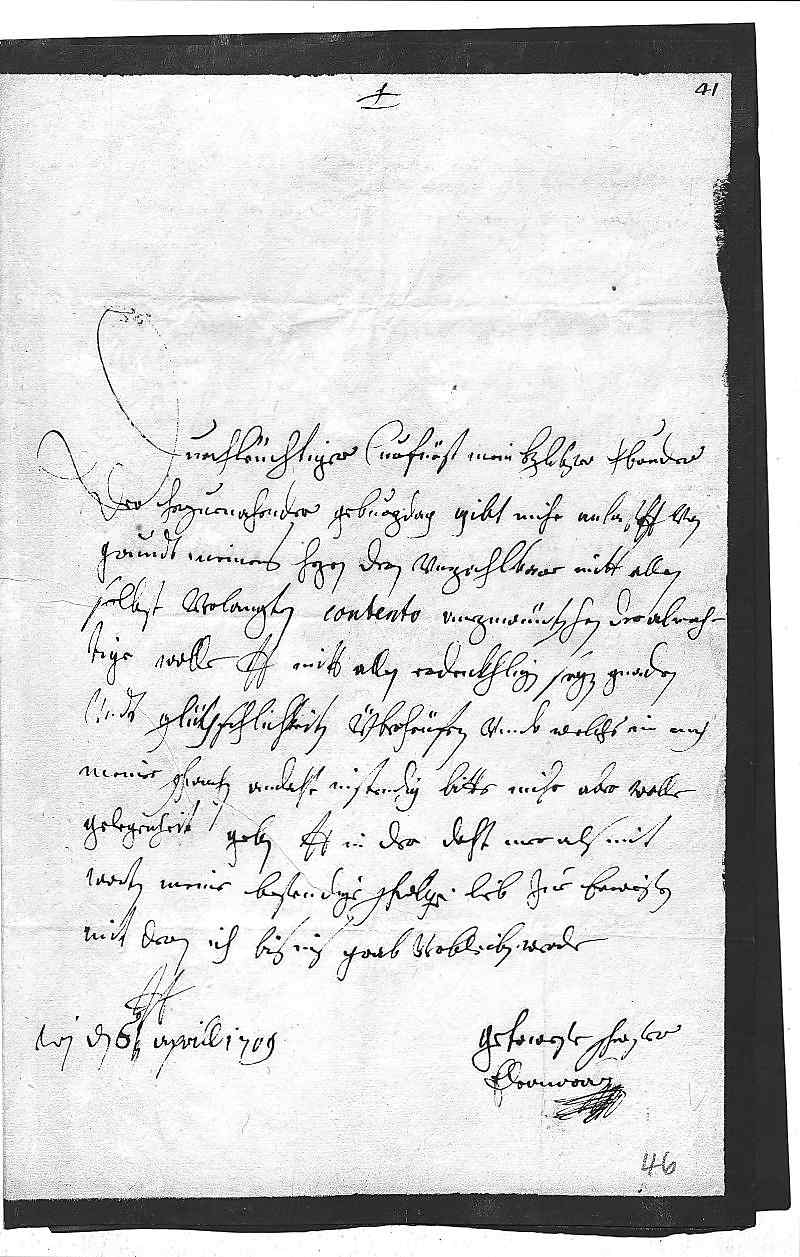 0001Durchleüchtiger Curfürst, mein herzlibster herr bruder 0002Der herzuenahender geburzdag gibt mihr anlaß, dero Liebden von 0003grundt meines herzen dern vnzahlbaar mitt allen 0004selbst verlangten contento anzuwüntschen. Der almech- 0005tige wolle dero Liebden mitt allen erdenkhligen segen, gnaden 0006vndt glükhsehlichkeiten überheüfen, vmb welchs in nach 0007meiner schwachen andacht instendig bitte. Mihr aber wolle er0008gelegenheit geben, dero Liebden in der daht mer als mit 0009worten meine bestendige schwesterlige lieb zue erweißen, 0010mit deren ich bis ins grab verbleiben werde 0011dero Liebden 0012getreweste schwester 0013Eleonora 0014Wien den 6ten aprill 1709