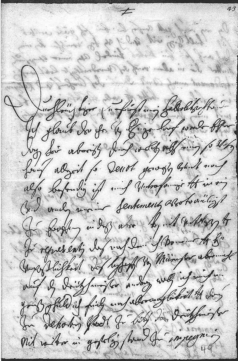 0001Durchleüchtiger Curfürst, mein herzallerlibster herr bruder 0002Ich glaub, der Grav von Sinzendorf werde ehster 0003dagen hier abreisen, durch welchen als einen, so vnsren 0004haus allezeit so deuot geweßen vndt noch 0005also bestendig ist, mich vnterfange dero Liebden in ein 0006vnd andren meine sentimenten vertraüligst 0007zu eröffnen. In deßen aber kan nit unterlaßen, dero Liebden 0008zu representirn, das nach dem ich verneme, dass dero Liebden bey 0009vnpaßlichkeit des Bischoffen von Münster abermahl 0010auf den Deütschmeister andragen wollen, ich mich in 0011gewißen schuldich finden, nach allermoglickeit dero Liebden drum 0012zu dehortiren vndt zu bitten, den Deütschmeister 0013nit weiter in geisteligen stand zu impegniren,