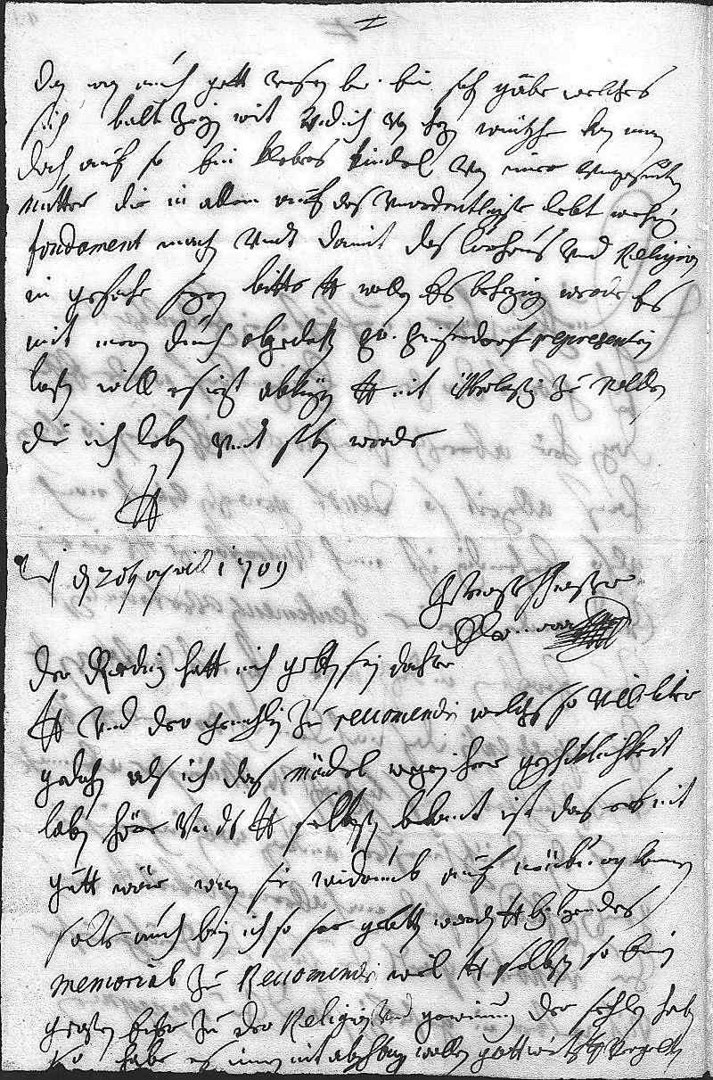 0014dan wan auch gott vnsern bruder ein sohn gäbe, welches 0015sich balt zeigen wirt vnd ich von herzen wüntsche, kan man 0016doch auf so ein klebers kindel von einer vngesunten 0017mutter, die in allem auf das vnordentligste lebt, wehnig 0018fondament machen vndt damit das curhaus vnd religion 0019in gefahr sezen. Bitte, dero Liebden wollen es beherzigen, werde es 0020mit meren durch obgedachten Grav Sinsendorf representirn 0021laßen, will es iezt abkürzen, dero Liebden nit überlestig zu vallen, 0022die ich leben vndt sterben werde 0023dero Liebden 0024getrewste schwester 0025Eleonora 0026Wien den 20ten aprill 1709 0027Der Radig hatt mich gebeten, sein dochter 0028dero Liebden vnd dero gemahlin zu reccomendirn, welchs so vill liber 0029gedahn, als ich das mädel wegen ihrer geschiklichkeit 0030loben höre vndt dero Liebden selbsten bekant ist, das es nit 0031gutt wär, wan sie widrumb auf Neüburg kommen 0032solte. Auch bin ich so ser gebetten worden, dero Liebden beyligendes 0033memorial zu reccomendir. Weil dero Liebden selbsten so einen 0034grosen eifer zu der religion vnd gewinnung der sehlen haben, 0035so habe es innen nit abschlagen wollen, gott wirts dero Liebden vergelten.