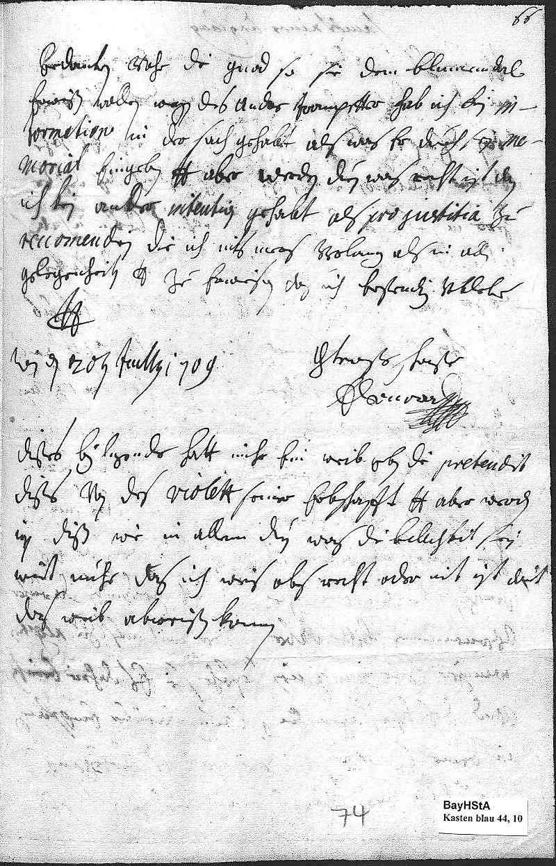 0072auf ewich obligirn, auch den Kaißer, mich, auch mein 0073sohn Carl inen alle dankbarkeit schuldich sein. Wegen des 0074Wißer hab ich mich in dero Liebden disposition zwar nit zu 0075mischen, so vill aber finde mich schuldich zu seiner 0076vndt meiner exculpation zu melden, das er nit 0077mich angeloffen, dero Liebden wegen seiner zu beheligen, sondern 0078mihr nuhr die ordre comunicirt, welches er jah hatt 0079duen müeßen, ich aber, weil ich glaubt, das er dero Liebden 0080hir noch gutte dienst duen könte, weil er die ministros 0081schon kendt, den modum hier zu tractiren erlernt vndt 0082von dem gahrzugroßen eifer, so er woll anfangs etwas 0083gehabt, die hörner schon zimlich abgestoßen hatt, 0084so hab ich mich aus gutter meinung zu dero Liebden dienst allein 0085vnterstanden, meine meinung zu schreiben. Weilen es dero Liebden 0086aber anderst zu dero dienst finden, hab ich niks 0087dazue zu sagen als zue wüntschen, das sie einen solchen 0088an sein stell möchten her schiken, mitt deme sie beßer 0089als durch in möchten bedient werden. Er hatt sich