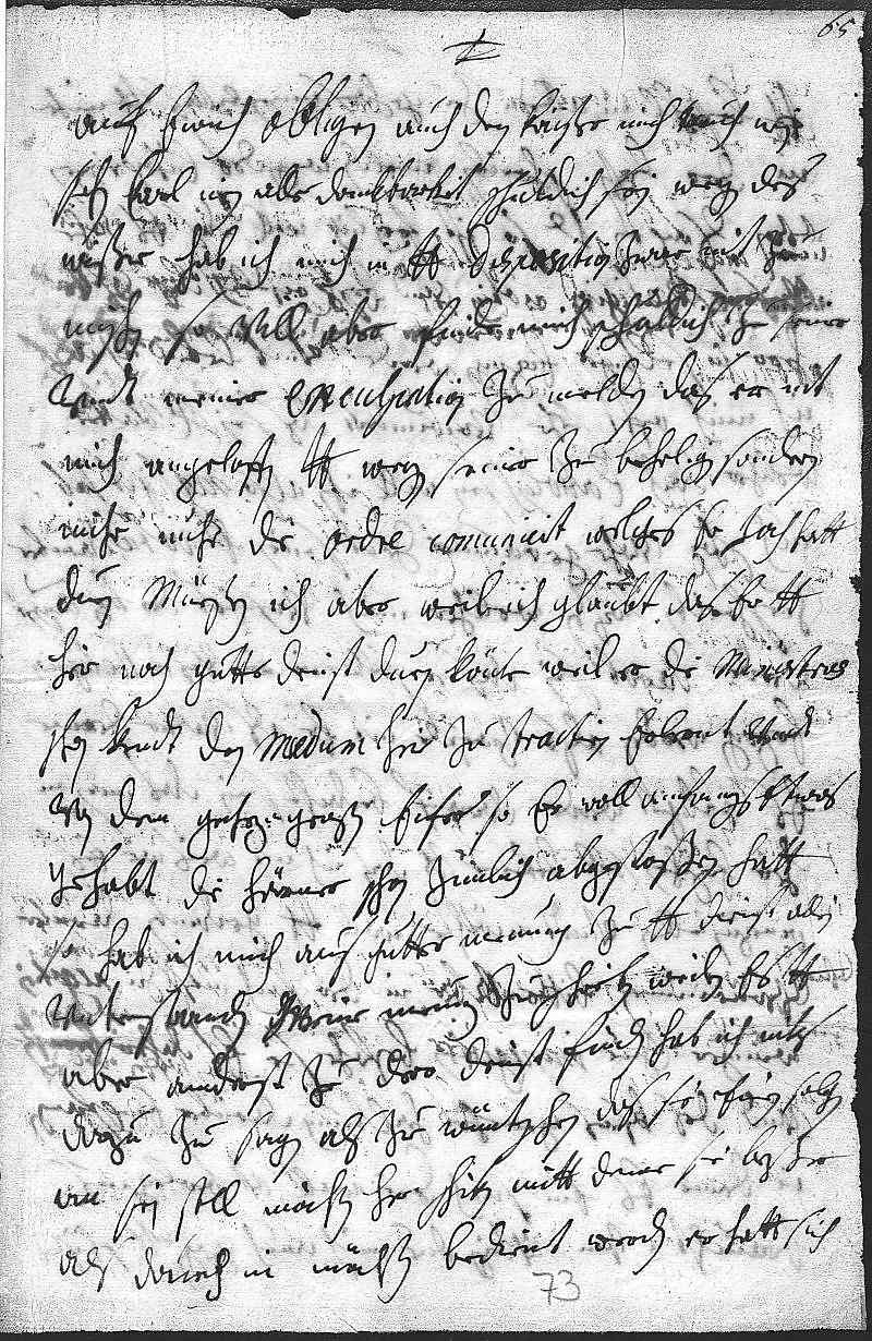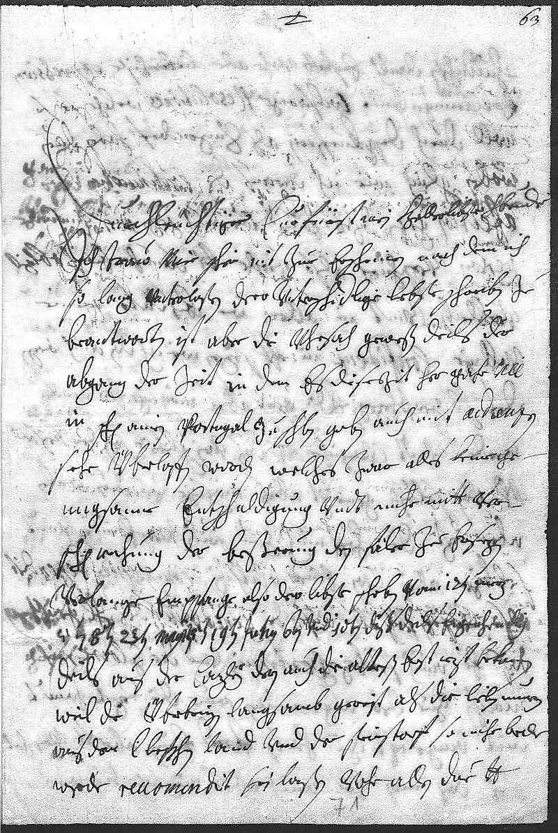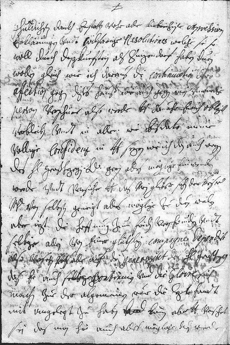 0001Durchleüchtiger Curfürst, mein herzallerlibster herr bruder 0002Ich traw mir schir nit zue erscheinen, nach dem ich 0003so lang vnterlaßen, dero vnterschidlige liebste schreiben zu 0004beantworten. Ist aber die vhrsach geweßen deils der 0005abgang der zeit, in dem es disezeit her gahr vill 0006in Schpanien und Portugal zu schreiben geben, auch mit audienzen 0007sehr überloffen worden bin, welches zwar alles keine ge- 0008nugsame entschuldigung vndt nuhr mitt ver- 0009schprechung der beßerung den fäler zu ersezen 0010verlange. Empfange also dero libste schreiben vom 12ten merz, 00115ten, 8ten, 23ten maij, 5ten, 19ten junij, 6ten vnd 10ten diß, teils eigenhendig, 0012deils aus der canzley, dern auch die altesten erst iezt bekomen, 0013weil die überbringer langsamb gereist, als die lieben muem 0014aus dem clefschen land vnd der Steirstorf, so mihr bede 0015werde reccomendirt sein laßen. Vohr allen due dero Liebden