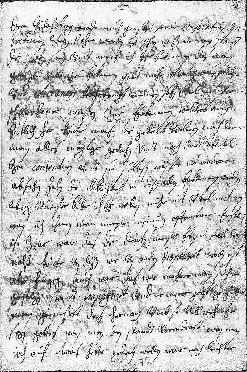 0034Dem Schoßberg werde auch gern zu seiner consolation con- 0035tribuiren. Wegen Rohm werden dero Liebden schon wißen, in was standt 0036die sachen sein, vndt mueß ich dero Liebden bekennen, das man 0037gar zu vill zu erkennen gibt, nuhr allerley ausfluchten 0038vnd chiccaneri vohrbringt, meinen sohn Carl nit ver- 0039schprochener maßen zue erkennen, welches auch 0040entlich hier könte machen die gedult verliren, nach dem 0041man alles möglige gedahn vndt noch duet, ihr Heiligkeit 0042zue contentiren, vndt sie selbsten, wan sie nit andere 0043absehen haben, die billichkeit in disen allen erkennen werden. 0044Wegen Münster bitte ich, dero Liebden wollen mihr nit übel nemmen, 0045wan ich ihnen mein inerste meinung offenbare, erstlich 0046ist zwar war, das der Deütschmeister eben in fall der 0047noht könte von disen wie von andren dispensirt werden, ist 0048aber hingegen auch war, das wie mehrer man sich in 0049geistligen standt impegnirt vnd ie mere geistlige gütter 0050mann genießet, das hernach vmb so vill wehniger 0051segen gottes, wan man den standt verendert. Wan man 0052iah auf etwas hette gedenken wollen, war noch leichter
