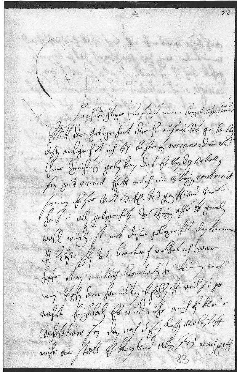 0001Durchleüchtiger Curfürst, mein herzallerlibster herr bruder 0002Mit der gelegenheit der hinaufreis des Graven Hamilton, 0003deßen anligenheit ich dero Liebden bestens reccomendir vnd 0004ihme zeüchnus geben kann, das er von den rebellen 0005sein gutt ruinirt hatt, auch im übrigen continuirt, 0006seinen eifer vndt vndt vnterdehnigste trew gegen dero Liebden vnd vnser 0007haus in allen gelegenheiten zue zeigen, also dero Liebden gnaden 0008woll würdig ist. Mit diser gelegenheit dan komme, 0009dero Liebden liebste schreiben zue beantworten, welches ich zwar 0010hoffe, etwan müntlich beantworten zu können, weil 0011mein sohn dem Hamilton befohlen, dero Liebden, weil sie so 0012nahet, einzuladen. Es wurd mihr auch kein kleine 0013consolation sein, dan nach disen lezten verlust dero Liebden 0014mihr an statt eltern vnd alls sein, nach gott