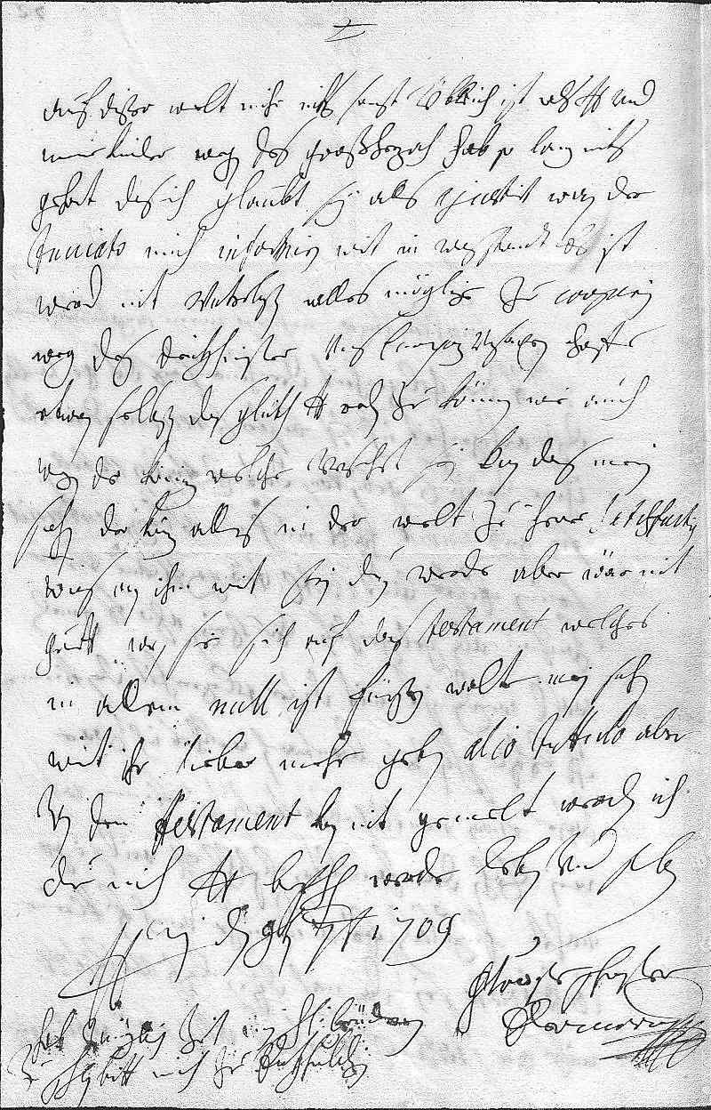 0015auf dißer welt mihr niks sonst übrich ist als dero Liebden vnd 0016meine kinder. Wegen des Großherzoch hab so lang niks 0017gehort, das ich glaubt, es sey alls ajustirt, wan der 0018inuiato mich informiren wirt, in was standt es ist, 0019werd nit vnterlaßen alles möglige zue cooperirn. 0020Wegen des Deutschmeister vnd Curprinz von Saxen hoffe, 0021etwan selbsten das glükh zu haben, mit dero Liebden reden zu können, wie auch 0022wegen der Königin, welche versichert sein kan, das mein 0023sohn, der König, alles in der welt zu ihrer satisfaction, 0024was an ihm wirt sein, duen werde. Aber wär nit 0025guett, wan sie sich auf das testament, welches 0026in allem null ist, füeßen wolte, mein sohn 0027wirt ihr lieber mehr geben alio tuttulo, aber 0028von dem testament kan nit gemelt werden. Ich 0029due mich dero Liebden befehlen, werde leben vnd sterben 0030dero Liebden 0031getrewste schwester 0032Eleonora 0033Wien den 9ten septembris 1709 0034Hab vnmöglich zeit, mein herren brüdern 0035zu schreiben, bitt mich zue entschuldigen.
