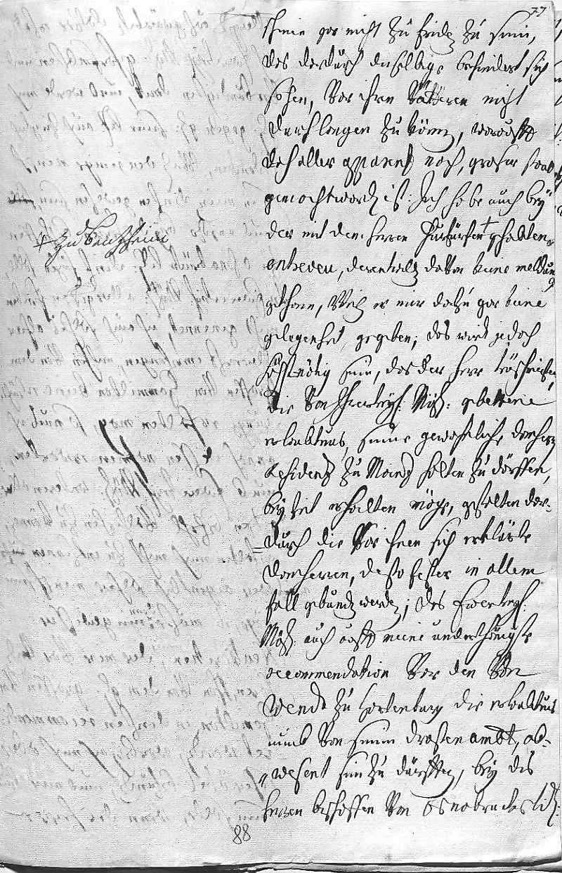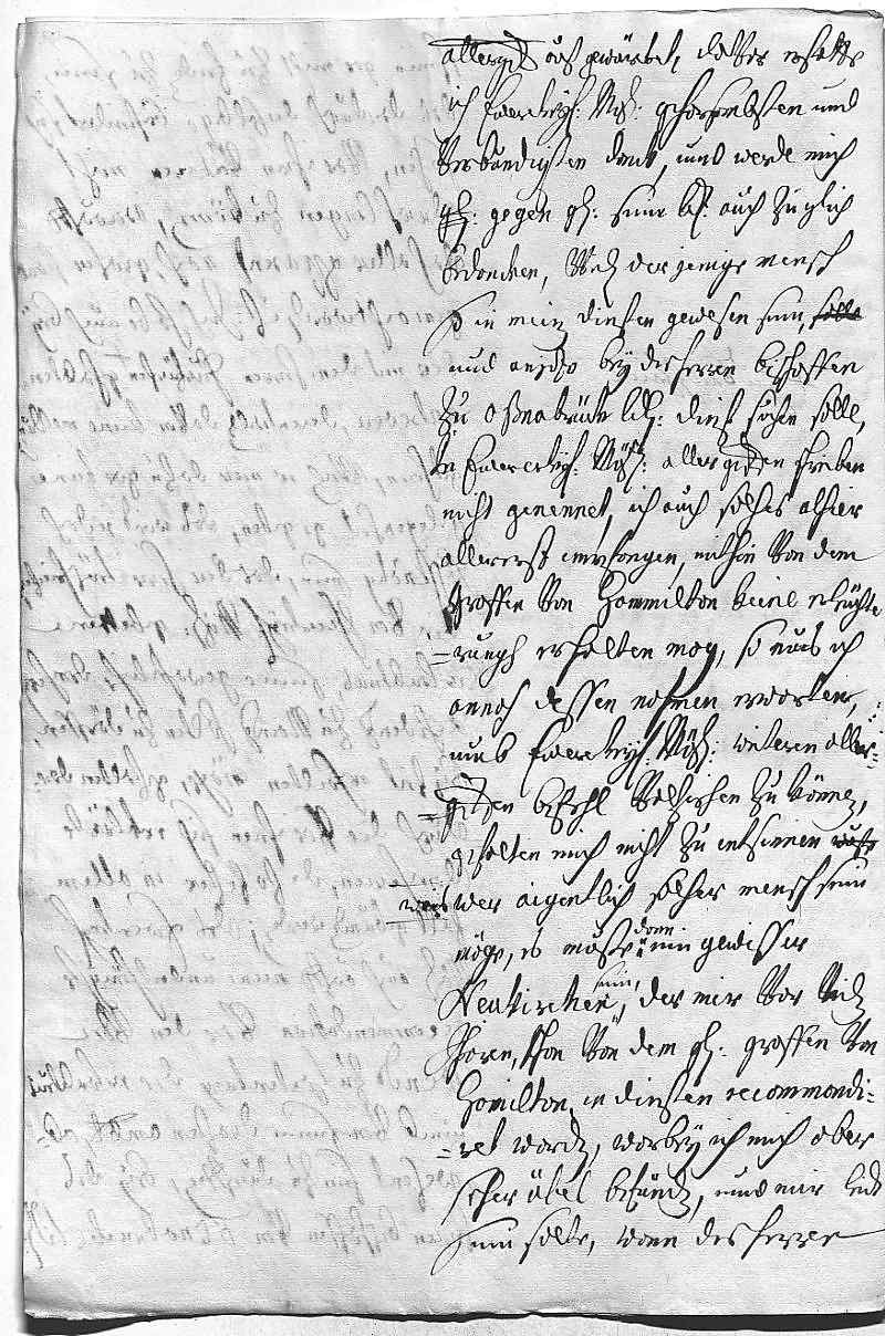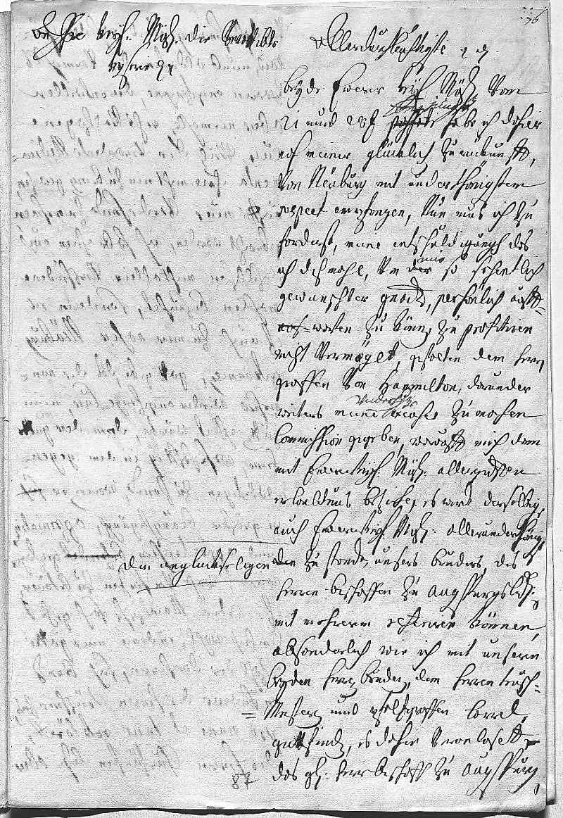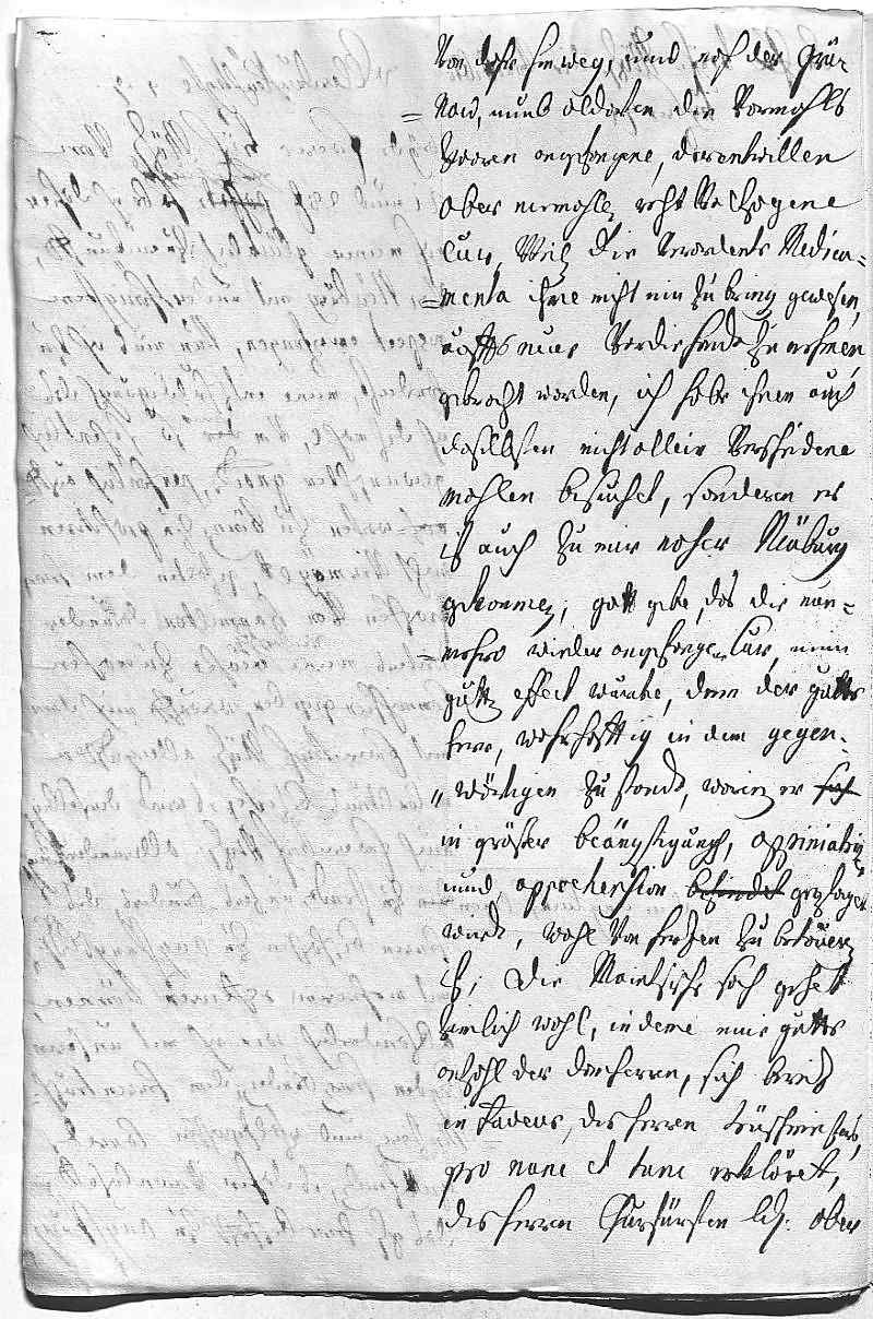 Entschuldigt sich, dass er diesmal der Einladung, EMT persönlich aufzuwarten, nicht folgen konnte. – Graf Hamilton wird über den unglückseligen Zustand des Bischofs von Augsburg (Bruder Alexander Sigismund) berichten. Hat veranlasst, dass der Bischof, der von Ängsten und Vorahnungen geplagt wird, seine Kur in der Grünau wiederaufnimmt. – In Mainz hat sich bereits eine gute Anzahl der Domherren für den (Hoch- und) Deutschmeister (Bruder Franz Ludwig) ausgesprochen; der Kurfürst scheint aber gar nicht zufrieden. Es ist nötig, dass der (Hoch- und) Deutschmeister beizeiten die kaiserliche Erlaubnis erhält, seine Domherrenresidenz in Mainz zu halten. – Dankt EMT dafür, dass sie beim Bischof von Osnabrück für den von Wendt zu Hartenburg die Erlaubnis zur Abwesenheit von seinem Drostenamt erwirkt hat. – Falls der Mensch, der in seinem Dienst gewesen sein soll und nun zum Bischof von Osnabrück will, ein gewisser Neukirchen ist, kann er ihn nicht empfehlen.