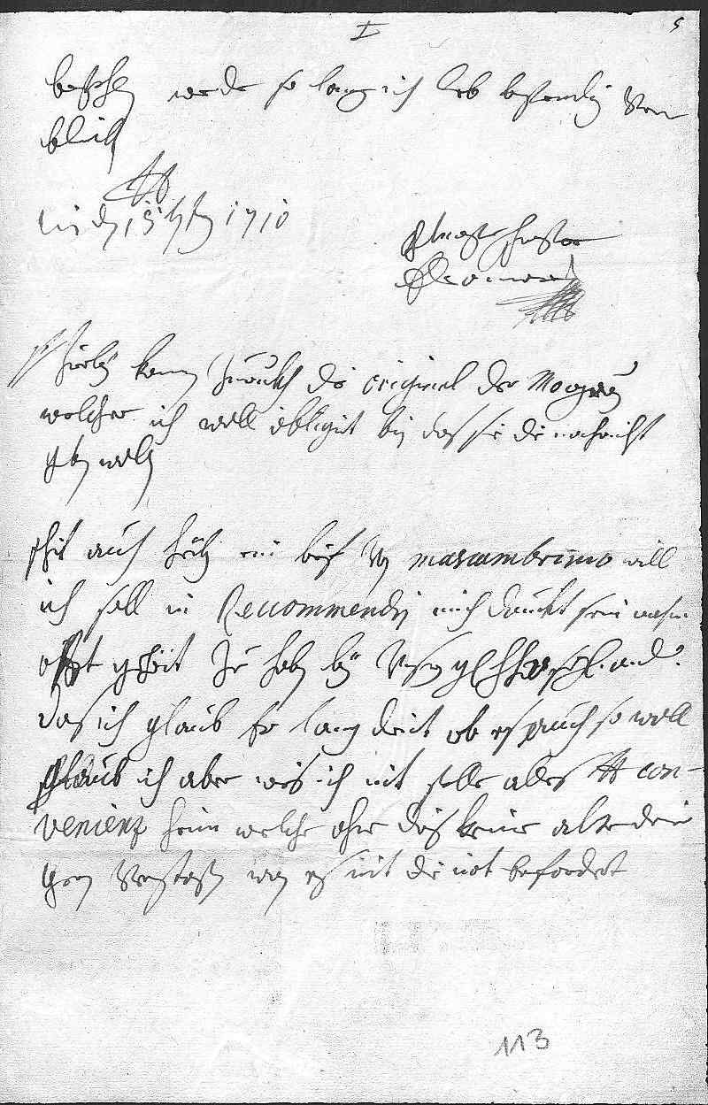 0115befehlen, werde so lang ich leb bestendig ver- 0116bleiben 0117dero Liebden 0118getrewste schwester 0119Eleonora 0120Wien den 15ten jener 1710 0121Postscriptum Hierbey kommen zurukh die original der Morgrauen, 0122welcher ich woll obligirt bin, das sie die nachricht 0123geben wollen. 0124Schik auch hirbey ein brif von Mascambruno, will, 0125ich soll in reccommendiren. Mich dunkt, sein nahm 0126offt gehört zu haben bey vnsern gnädigen herrn vater sehligen, und 0127das ich glaub, das er lang dient hat, ob es auch so woll, 0128glaub ich, aber weis ich nit, stelle alles dero Liebden con- 0129venienz heim, welche ohne dis keine alte diener 0130gern verstoßen, wan es nit die not erfordert.