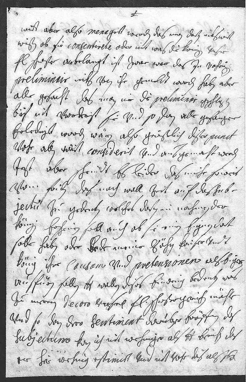 0056wirt aber also menagirt werden, das man dorten niks wirt 0057wißen, ob sie consentirete oder nit. Was die Konigin, vnser 0058fraw schwester, anbelangt, ist zwar war, das zu vohrigen 0059preliminair niks von ihr gemeldt worden, haben aber 0060alle gesacht, das man nie die preliminair geschloßen, 0061bis nit vorderist sie vnd so dan alle gefangene 0062erlediget worden wären, also gewißlich diser punct 0063vohr allen wirt considerirt vnd ausgemacht werden. 0064Jezt aber scheindt es leider, das mihr so weit 0065vom friden, das noch woll zeit, auf das sub- 0066jectu zu gedenken, welches dorten in nahmen der 0067Königin erscheinen soll, auch ob sie einen eignen dort 0068solle haben oder bede meine söhn, Kaiser vndt 0069König, ihre causam vnd pretensionen als eigene 0070ausfürn sollen. Dero Liebden wollen dises einwenig bedenken, was 0071zu meren decoro vnser fraw schwester gereichen möchte, 0072vnd so dan dero sentiment darüber eröffnen. Das 0073subjectum betreffend kan ich nit wehniger als dero Liebden berichten, das 0074er hir wehnig estimirt vnd nit vohr das als sey