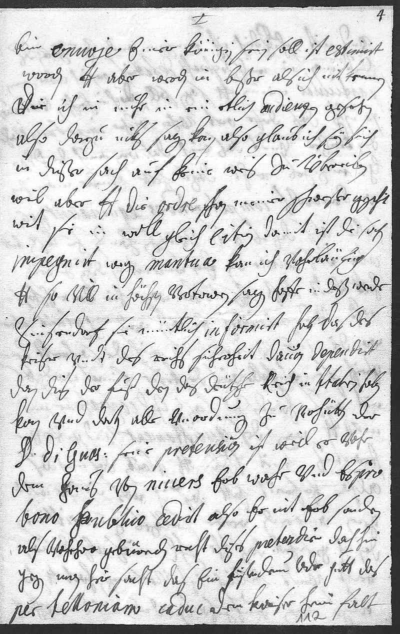 0075ein enuoje einer Königin sein soll, ist estimirt 0076worden, dero Liebden aber werden in beßer als ich nit kennen, 0077die ich in nuhr in ein etlich andienzen gesehen, 0078also darzu niks sagen kan. Also, glaub ich, sey sich 0079in dißer sach auf keine weis zu übereilen. 0080Weil aber dero Liebden die ordre schon meiner schwester geschikt, 0081wirt sie in woll gleich citiren, damit ist die sachen 0082impegnirt. Wegen Mantua kan ich vohrlaüfig 0083dero Liebden so vill in höchsten vertrawen sagen, hoffe, in deßen werde 0084Sinsendorf sie müntlich informirt haben, das des 0085Keiser vndt des Reichs sicherheit dauon dependirt, 0086dan dis der Fürst, den das deütsche Reich in Italien haben 0087kan vnd dorten alle vnordungen zu verhütten. Der 0088Duca di Guastalla seine pretension ist, weil er vohr 0089dem haus von Niuers erb wahr vnd es pro 0090bono publico cedirt, also er nit erb, sondern 0091als vorhrhero gebürenden recht dises pretendir, dah hin 0092gegen man hir sacht, das ein fürstendum oder gutt, das 0093per felloniam caduc, dem Kaiser heim falt