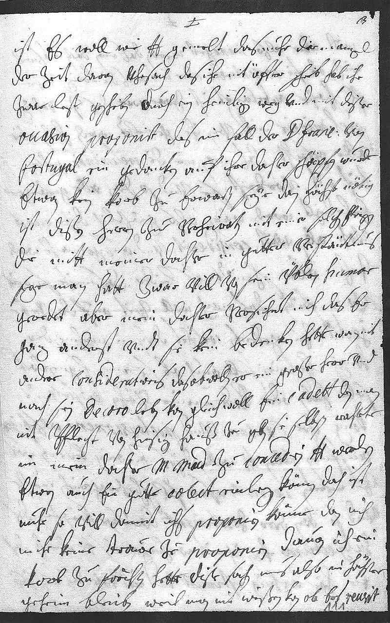 0036ist es woll wie dero Liebden gemelt, das nuhr der mangel 0037der zeit daran vhrsach, das ihr nit offter schreib, hab ihr 0038zwar lest geschriben durch ein heimligen weg vnd mit dißer 0039occasion proponirt, das, im fall der Don Francisco von 0040Portugal ein gedanken auf ihre dochter schöpfen wurde, 0041etwan kein korb zu erwarten seye, dan höchst nötig 0042ist, dißen herrn zue verheiraten mit einer solchen prinzessin, 0043die mitt meiner dochter in gutter verstäntnus 0044seye. Man hatt zwar vill von sein üblen humor 0045geredet, aber mein dochter versichert mich, das er 0046ganz anderst vndt sie kein bedenken hette, wan nit 0047andere considerationes, das, obwollen er ein großer herr vnd 0048nach sein decoro leben kan, gleich woll ein cadett, den man 0049nit pflegt töchter von hisigen hauß zu geben, sie selbsten erachtete, 0050im mein dochter Maria Magdalena zu concediren. Dero Liebden werden 0051etwan auch ein gutte colect einlegen können, doch ist 0052nuhr so vill damit ichs proponiren könne, dan ich 0053mihr keine trawe zu proponiren, dauon ich ein 0054korb zu förchten hette. Dise sachen mus also in höchster 0055geheim bleiben, weil man nit wißen kan, ob ers reusirt,