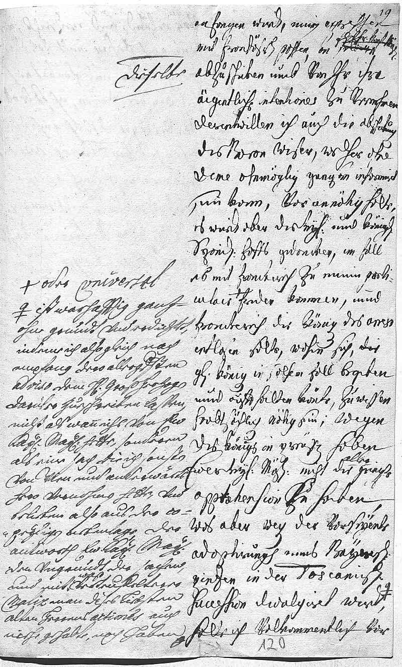 Dankt für EMTs Briefe; konnte sie nicht eher beantworten, weil er Herzklopfen hatte. – Hat wegen der Arrestierung des Kommissars, der die kaiserliche Artillerie durch die Oberpfalz führen sollte, bereits dem Kaiser geschrieben. – Stimmt EMTs Überlegungen zur Verheiratung der Prinzessinnen ihrer Brüder Pfalzgraf Philipp und Pfalzgraf Karl (Philipp) zu; hat bereits bei der wunderlichen Mutter der ersteren (Schwägerin Anna Franziska von Toskana) eine Sondierung veranlasst. – Prinz Eugen ist nicht durch Düsseldorf gekommen, sondern über Berlin nach Den Haag gereist. – Dankt EMT, dass sie für die verwitwete Königin von Spanien (Schwester Maria Anna) gesorgt hat. Wird einen Kurier mit der französischen Post zur Königin schicken, sobald die Friedensverhandlungen förmlich beginnen, um zu erfahren, was sie möchte. Es wäre auch wichtig, die Pläne des kaiserlichen und des spanischen Hofs für sie nach ihrer Entlassung aus der französischen Haft zu wissen. – Vom König in Preußen braucht EMT nichts befürchten. – Die angeblich geplante Adoption eines bayerischen Prinzen als Nachfolger in der Toskana ist erfunden und erdichtet. Bittet EMT, künftig derartige Verleumdungen gegen den Großherzog (von Toskana) zu bestrafen.