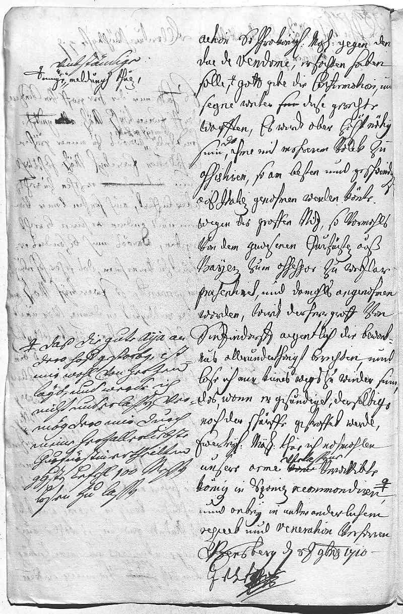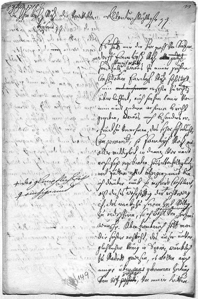Graf Sinzendorf hat JW EMTs Brief vom 19. Oktober überbracht und Bericht erstattet. – Über Frankreich kommt die Nachricht, dass König (Karl) von Spanien wirklich in Madrid war; angeblich hat er auch einen weiteren Sieg über den Duc de Vendome errungen. – Wegen des Grafen Niz , der vom vormaligen Kurfürsten von Bayern zum Assessor in Wetzlar präsentiert wurde, wird Graf Sinzendorf berichten. – Empfiehlt EMT nochmals die arme verlassene verwitwete Königin von Spanien (Schwester Maria Anna). – Bedauert sehr, dass die gute Aja gestorben ist und wird 100 Messen für sie lesen lassen.