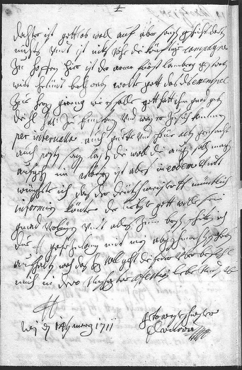 0017dochter ist gottlob woll auf, aber sonsten geschicht dorten 0018nichts vndt ist niks vohr die könftige campagne 0019zu hoffen. Hier ist der arme Fürst Lamberg gestorben, 0020wirt heündt begraben, wolte gott, das dis exempel 0021zue herzen gieng wie es solle. Gott hatt ihm gnad geben, 0022die heiligen sacramente zu empfangen, vnd wan er zusich kommen 0023per interualla hat er auch guette vnd schöne acten gemacht, 0024auch posten sagen laßen, die woll die augen sollen machen 0025aufgehn. Im übrigen ist alles in eodem vndt 0026wünschte ich, das der Deütschmeister dero Liebden müntlich 0027informiren könte. Der liebste gott wolle sein 0028gnad verleyen vndt alles zum besten schiken. Ich 0029due dero Liebden gahr zulang mit mein abgeschmachten schreiben 0030aufhalten, woh das herz voll, geht die feder über. Befehl 0031mich in dero vnschazbar affection, lebe vnd sterb 0032dero Liebden 0033getreweste schwester 0034Eleonora 0035Wien den 14ten merz 1711