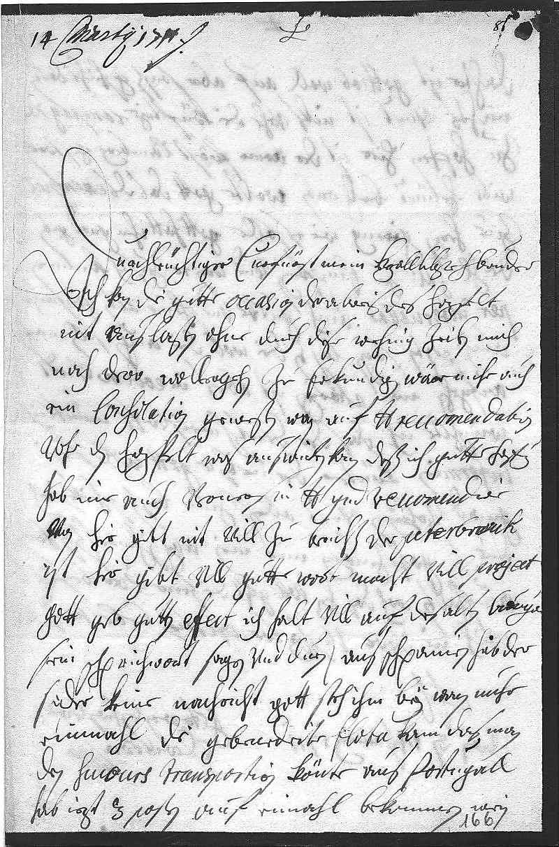 000114 martij 17110002Durchleüchtiger Curfürst, mein herzallerliebster herr bruder 0003Ich kan die gutte occasion der abreis des Hazfelt 0004nit auslaßen, ohne durch diese wehnig zeilen mich 0005nach dero wollergehn zu erkundigen. Wäre mihr auch 0006ein consolation geweßen, wan auf dero Liebden reccomendation 0007vohr den Hazfelt was auswirken kann, deßen ich gutte hoffnung 0008hab, ine auch verners in dero Liebden gnade reccomendire. 0009Von hir gibt nit vill zu berichten, der Peterbrouk 0010ist hier, gibt vill gutte wort, macht vill project, 0011gott geb gutten effect, ich halt vill auf des alten Burga0012sein schprichwort, sagen vnd duen. Aus Schpanien hab der- 0013sider keine nachricht, gott steh ihm bey, wan nuhr 0014einmahl die gebenedeite flota kam, das man 0015den sucours transportiren könte. Aus Portugall 0016hab iezt 3 posten auf eimahl bekommen, mein