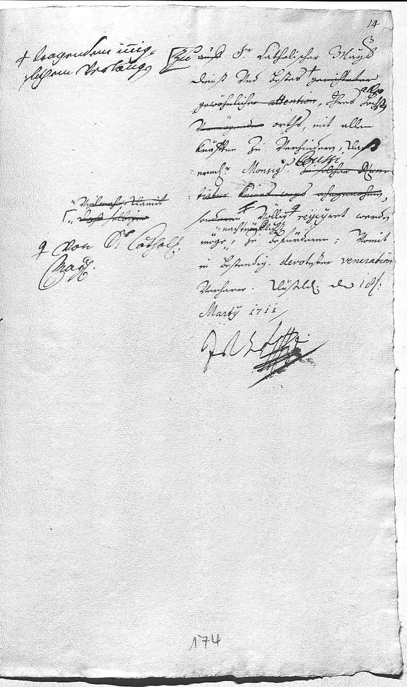 EMT weiß zweifellos bereits, dass unter anderen Monsignore Bussi zur Nuntiatur an den König (Karl) in Spanien vorgeschlagen wird, der derzeit Nuntius in Köln ist. So gerne JW diesen unvernünftigen, unwissenden und turbulenten Mann aus seiner Nähe entfernt sähe, so wenig wird dem König mit ihm gedient sein. Rät daher, seine Bestallung zu verhindern.