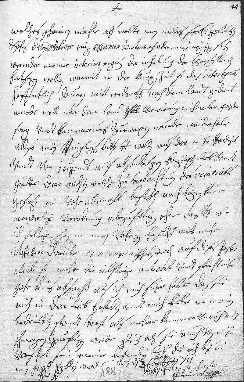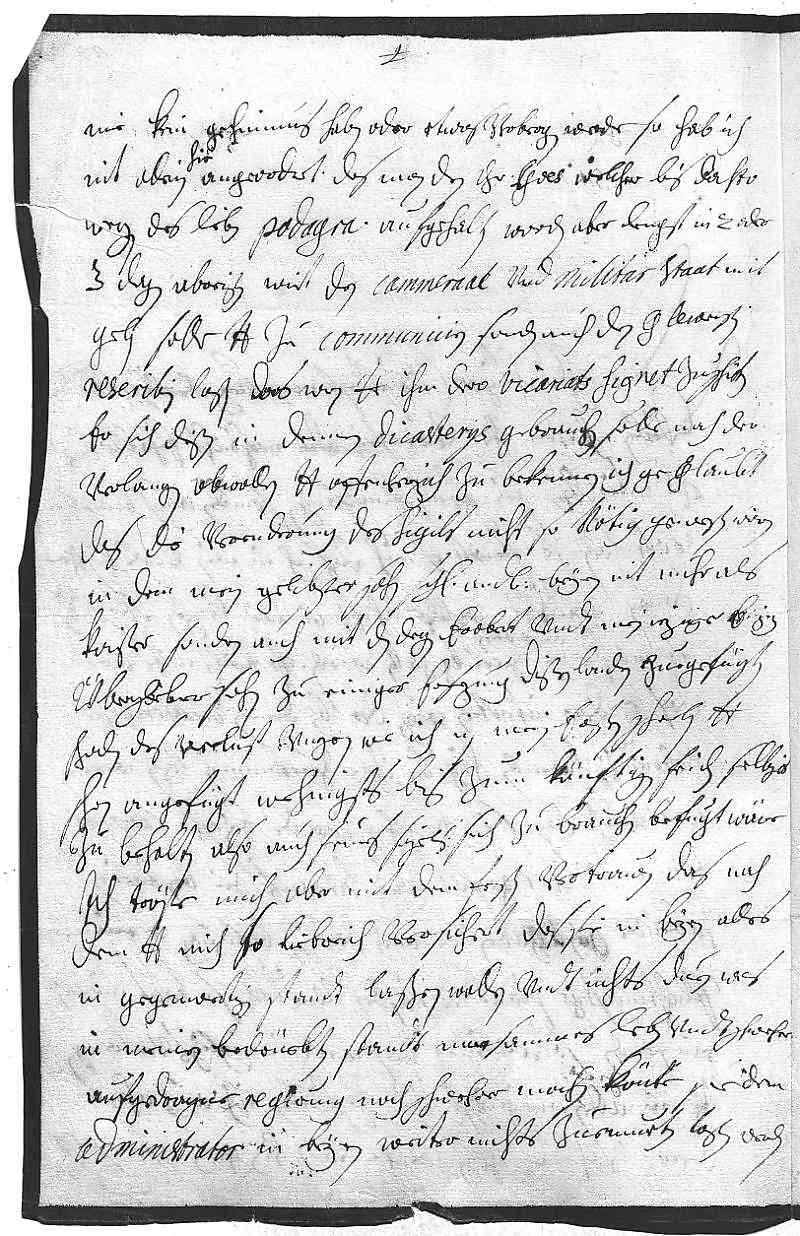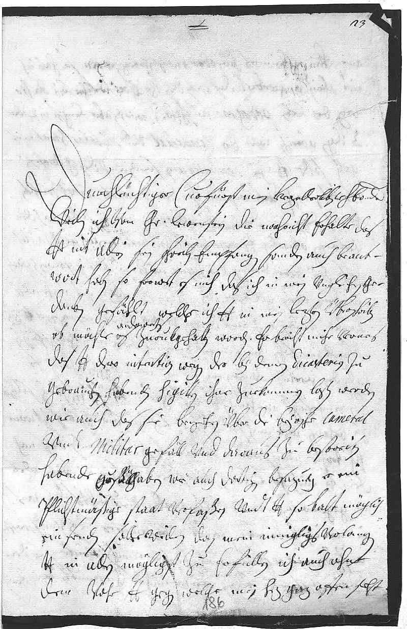 0001Durchleüchtiger Curfürst, mein herzallerlibster herr bruder 0002Weilen ich vom Graven Lewenstein die nachricht erhalte, das 0003dero Liebden nit allein sein schreiben empfangen, sondern auch beant- 0004wort haben, so frewet es mich, das ich in mein vngleichen ge- 0005danken gefählt, welche ich dero Liebden in mein lezten überschriben, 0006ob möchte es andernorts zurukgehalten worden sein. Er bericht mihr verners, 0007das dero Liebden dero intention wegen der bey dennen dicasterien zu 0008gebrauchen habenden sigillen ihne zuekommen laßen werden, 0009wie auch das sie begehren, über die beyrische cameral 0010vndt militar gefäll vnd daraus zu bestreiten 0011habende außgaben wie auch dortigen besazung, er ein 0012pflichtmäßige staat verfaßen vndt dero Liebden so balt möglich 0013ein senden solle. Weilen dan mein innigligs verlangen, 0014dero Liebden in allen mögligst zu erfüllen, ich auch ohne 0015dem vohr dero Liebden, gegen welche mein herz ganz offen steht