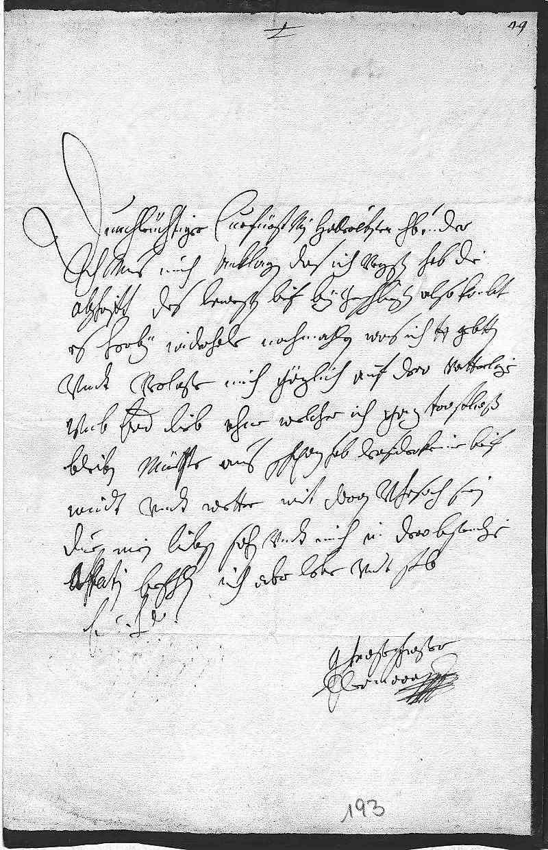0001Durchleüchtiger Curfürst, mein herzallerlibster herr bruder 0002Ich mus mich anklagen, das ich vergesen hab, die 0003abschrift des Lewestein brif bey zuschließen, also kombt 0004es herbey. Widerhole nochmahlen, was ich dero Liebden gebetten, 0005vndt verlaße mich gänzlich auf dero vatterlige 0006vmb brüderliche lieb, ohne welcher ich ganz trostloß 0007bleiben müste. Aus Schpanien hab dersider keine brif, 0008windt vndt wetter wirt daran vhrsach sein. 0009Due mein liebsten sohn vndt mich in dero bestendige 0010affection befehlen, ich aber lebe vndt sterb 0011ewer LIebden 0012getrewste schwester 0013Eleonora