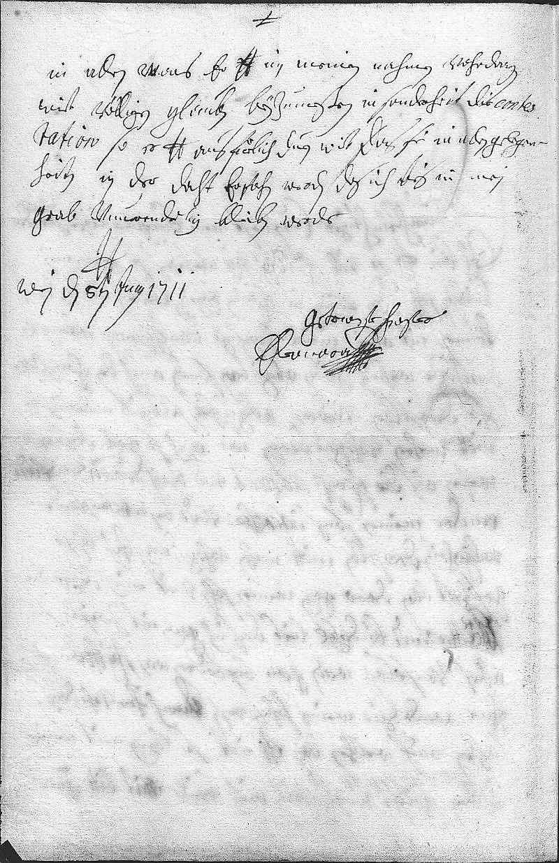 0017in allen, was er dero Liebden in meinen nahmen vohrdragen 0018wirt, völligen glauben beyzumeßen, in sonderheit die contes- 0019tation, so er dero Liebden ausfürlich duen wirt, das sie in allen gelegen- 0020heiten in der daht erfahren werden, das ich bis in mein 0021grab vnuorenderlig bleiben werde 0022dero Liebden 0023getrewste schwester 0024Eleonora 0025Wien den 8ten junij 1711