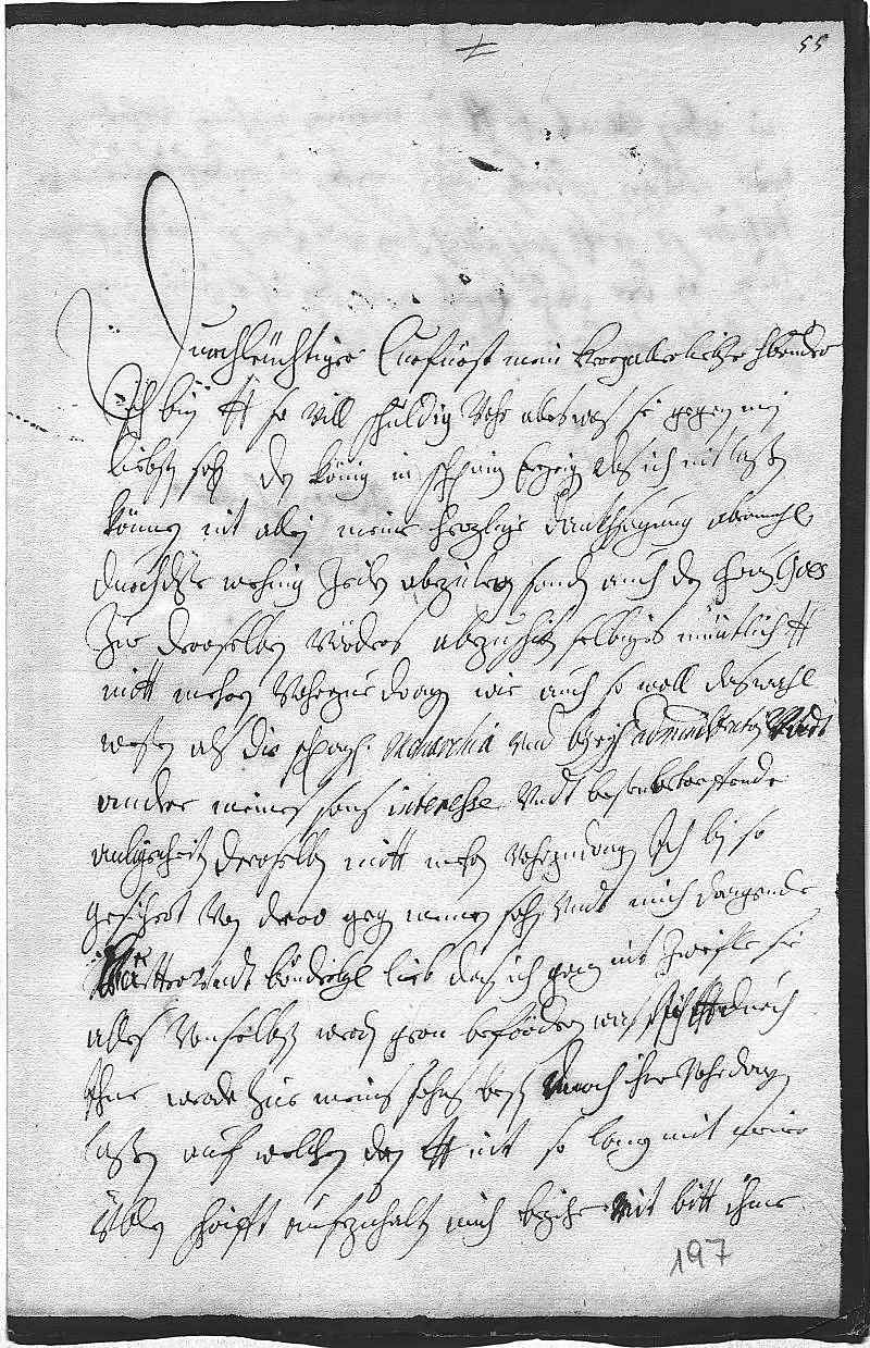 0001Durchleüchtiger Curfürst, mein herzallerliebster herr bruder 0002Ich bin dero Liebden so vill schuldig vohr alles, was sie gegen mein 0003liebsten sohn, den König in Schpanien, erzeigen, das ich nit laßen 0004können nit allein meine herzlige dankhsagung abermahl 0005durch dise wehnig zeilen abzulegen, sondern auch den Grauen Goes 0006zue deroselben vörders abzuschiken, selbiges müntlich dero Liebden 0007mitt mehren vohrzue dragen, wie auch so woll das wahl 0008wesen als die schpanische monarchia vnd beyrisch administration vndt 0009andere meines sons interesse vndt besten betreffende 0010anligenheiten deroselben mitt mehren vohrzudragen. Ich bin so 0011gesichert von dero gegen meinen sohn vndt mich dragende 0012vätter vndt brüderlige lieb, das ich ganz nit zweifle, dass sie 0013alles vonselbsten werden gern befördern, was ich dero Liebden durch 0014ihne werde zue meins sohns besten durch ihne vohrdragen 0015laßen. Auf welchen dan, dero Liebden nit so lang mit meiner 0016üblen schrifft aufzuhalten, mich bezihe mit bitt, ihme