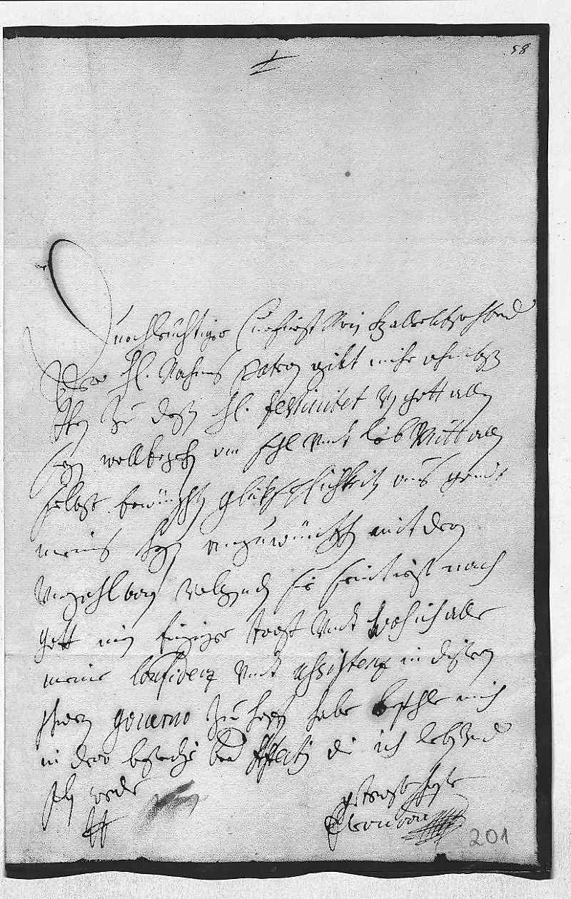 0001Durchleüchtiger Curfürst, mein herzallerlibster herr bruder 0002Der heilige nahms patron gibt mihr ahnlaß, 0003ihnen zu desen heiligen festiuiet von gott allen 0004segen und wollergehn an sehl vndt leib mitt allen 0005selbst erwünschten glükselichkeiten aus grundt 0006meines herzen anzuwüntschen mit deren 0007vnzahlbaren volgenden. Sie seint iezt nach 0008gott mein einziger trost, vndt woh ich alle 0009meine confidenz vndt assistenz in disen 0010schweren gouerno zu hoffen habe. Befehle mich 0011in dero bestendige brüderliche affection, die ich leben vnd 0012sterben werde 0013dero Liebden 0014getrewste schwester 0015Eleonora