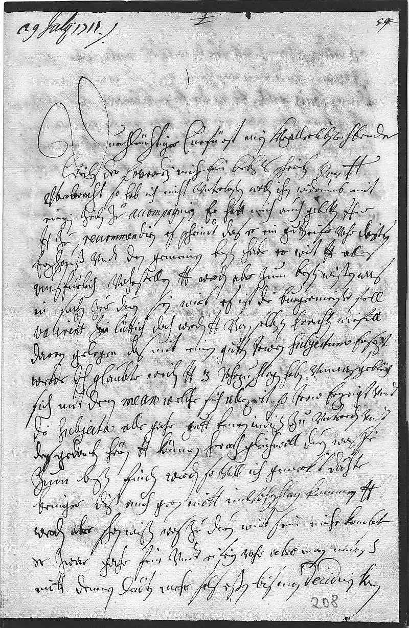 000129 julij 17110002Durchleüchtiger Curfürst, mein herzallerlibster herr bruder 0003Weilen der Corradi mihr ein liebsts schreiben von dero Liebden 0004vberbracht, so hab ich nicht vnterlasen wollen, ihn widrumb mit 0005einigen zeilen zu accompagniren. Er hatt mich auch gebetten, ihne 0006dero Liebden zu reccommendiren, es scheindt, das er ein gutten eifer vohr dißes 0007erzhauß vndt den gemeinen besten habe. Er wirt dero Liebden alles 0008ausfürlich vohrstellen, dero Liebden werden aber zum besten wißen, was 0009in sachen zue duen sein wirt. Es ist die burgermeister stell 0010vacirent zu Lüttich, dah werden dero Liebden von selbsten erachten, wiefill 0011daran gelegen, das sie mit einen gutten trewen subjectum ersezt 0012werde. Ich glaubte, weilen dero Liebden 3 vohrzuschlagen haben, vnmasgeblich 0013sich mit denen Mean, welche sich allezeit so trew erzeigt vndt 0014die subjecta alle gahr gutt kenen, in diß zu vntereden vndt 0015des gedanken hören, dero Liebden können hernach gleichwoll duen, was sie 0016zum besten finden werden. So vill ich gemerkt, dähte 0017bringer diß auch gern mitt in vohrschlag kommen, dero Liebden 0018werden aber schon wißen, was zu duen wirt sein. Mihr kombt 0019er zwar gahr fein vndt eifrig vohr, aber man mueß 0020mitt dennen leüten mehr fels eßen, bis man decidiren kann.