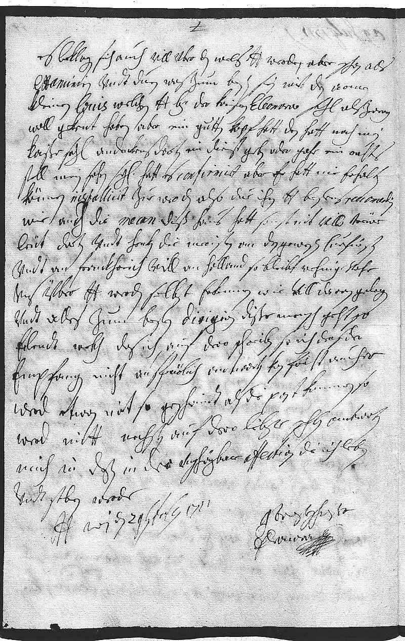 0021Es beklagen sich auch vill über den Wels, dero Liebden werden aber schon alls 0022examiniren vndt duen, was zum besten sein wirt. Den armen 0023kleinen Louis, welchen dero Liebden bey der Kaiserin Eleonora sehligen als zwerg 0024woll gekent haben, aber ein gutten kopf hatt, den hatt noch mein 0025Kaißer sehligen andenkens dorten ein dienst geben oder gahr ein rahts 0026stell, mein sohn sehliger hatt es confirmirt, aber er hatt nie erhalten 0027können, installirt zue werden. Also due ihn dero Liebden bestens reccomendiren, 0028wie auch die Mean, diß haus hatt sonst nit vill trewe 0029leüt dorten, vndt henken die meristen an den gewesten Curfürsten 0030vndt an Frankhreich, vill an Holland, so bleibt wehnig vohr 0031vns über. Dero Liebden werden selbst erkennen, wie vill daran gelegen, 0032vndt alles zum besten dirigirn. Dißer mensch geht so 0033eilendt wekh, das ich auf dero schreiben, so ich dersider 0034empfangen, nicht ausfürlich antworten kan, förcht auch, er 0035werd etwan nit so geschwindt als die post kommen, so 0036werd mitt nechsten auf dero liebste schreiben antworten, 0037mich in deßen in dero vnschäzbar affection empfehlen, die ich leben 0038vndt sterben werde 0039dero Liebden 0040getrewsteschwester 0041Eleonora 0042Wien den 29ten julij 1711