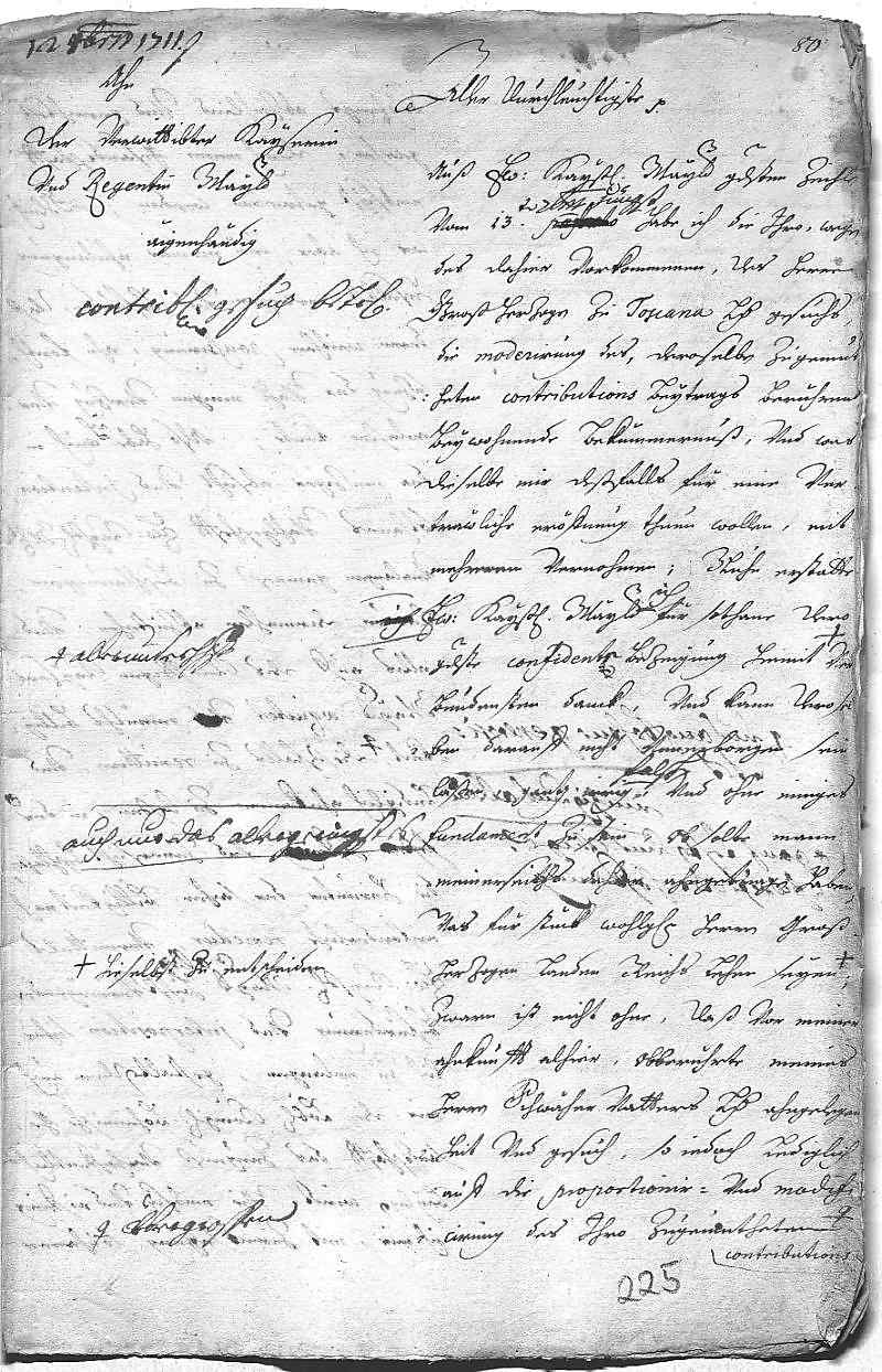 JWs Gesandtschaft hat zwar vor seinem Eintreffen in Frankfurt tatsächlich über die Höhe der Kontributionen seines Schwiegervaters (Großherzog von Toskana) verhandelt, bei seiner Ankunft hat er das aber eingestellt, um die Kaiserwahl nicht aufzuhalten. Hat der erwählten Majestät (Kaiser Karl VI.) wegen des Anliegens des Großherzogs geschrieben und vertraut auf EMTs Vermittlung.