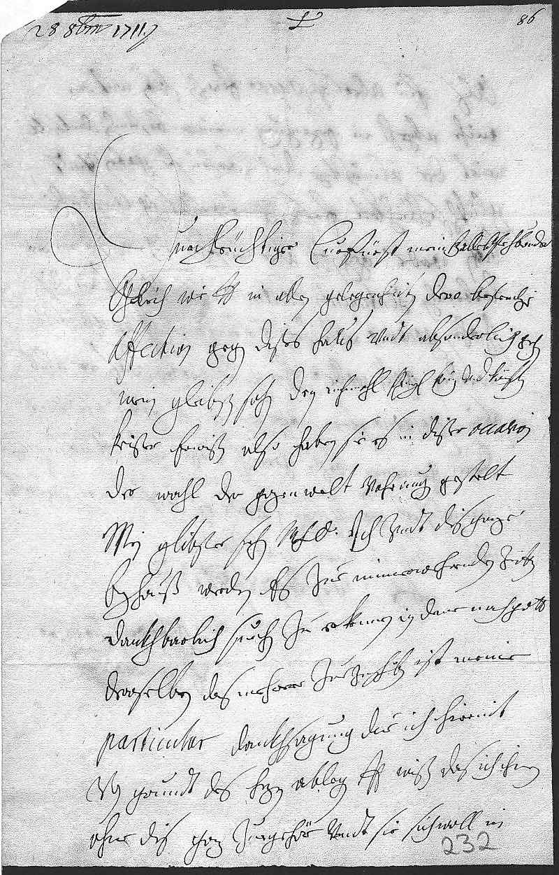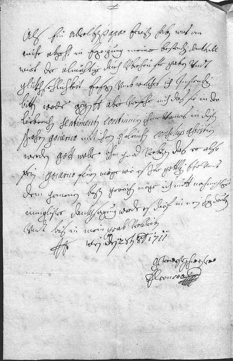 0015als ein allerlibster papa erwisen haben. Was an 0016mihr abgeht in erzeigung meiner bestendigen dankbarkeit, 0017wirt der almechtige durch überheüfte gaben vndt 0018glükhsehlichkeit ersezen, vmb welches ich instendig 0019bitten werde. Gegen dero Liebden aber versehe ich mich, das sie in dero 0020liebreichen sentimenten continuiren und ihme verners in disen 0021schwehren gouerno mit ihren erleüchten consilijs assistiren 0022werden. Gott wolle ihm gnad verleyen, das er also 0023sein gouerno füren möge, wie es zur gottligen ehr vndt 0024dem gemeinen besten gereichen möge. Ich, mitt nochmahlige 0025inniglister dankhsagung, werde es dief in mein herz druken 0026vndt bis in mein grab verbleiben 0027dero Liebden 0028getreweste schwester 0029Eleonora 0030Wien den 28ten octobris 1711