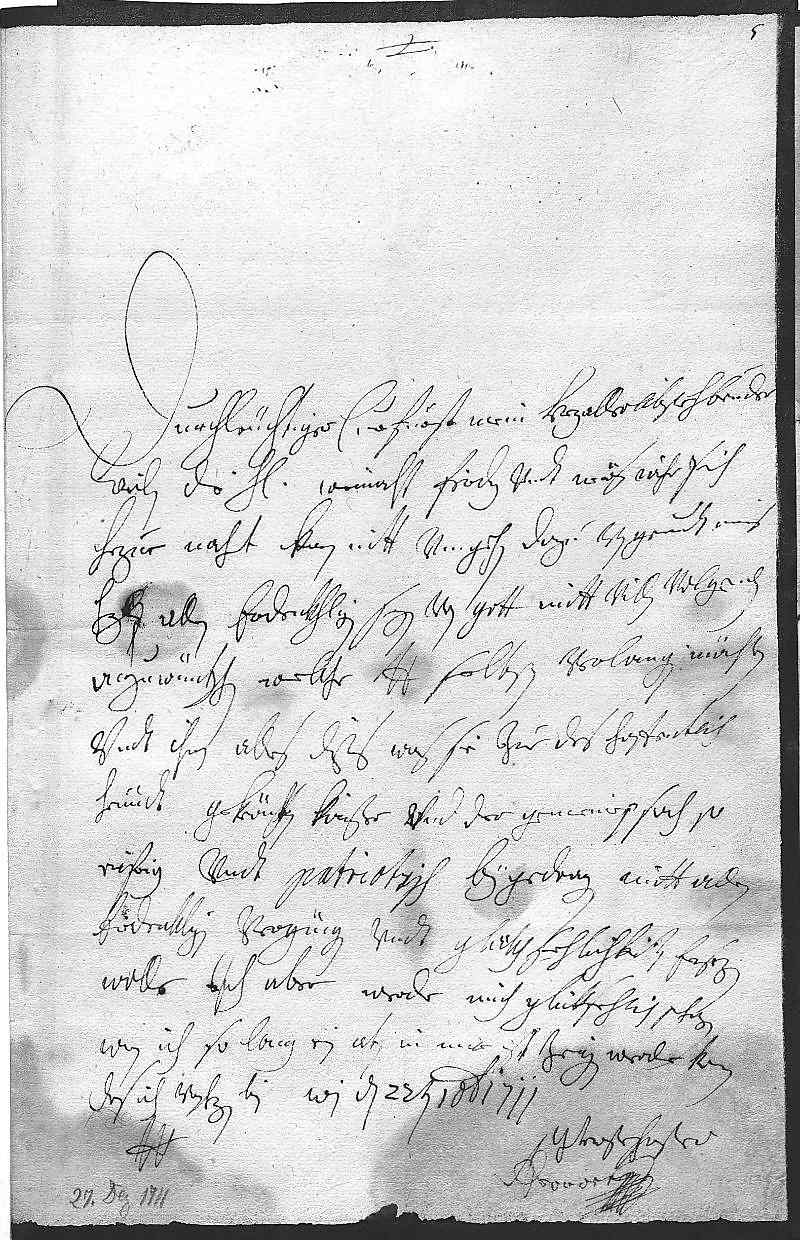 0001Durchleüchtiger Curfürst, mein herzallerlibster herr bruder 0002Weilen die heiligen weinacht feirdag vndt news iahr sich 0003herzue naht, kan nitt vmgehn, dazu von grundt meins 0004herzen allen erdenkhligen segen von gott mitt villen volgenden 0005anzuwüntschen, welche dero Liebden selbsten verlangen möchten, 0006vndt ihnen alles diss, was sie zue des hoffentlich 0007heündt gekrönhten Kaißer vnd der gemeinen sach so 0008eifrig vndt patriotisch beygedragen, mitt allen 0009erdenkligen vergnügen vndt glükhsehlichkeiten ersezen 0010wolle. Ich aber werde mich glüksehlich schezen, 0011wan ich, so lang ein atem in mir ist, zeigen werde konen, 0012das ich vonherzen bin 0013dero Liebden 0014getrewste schwester 0015Eleonora 0016Wien den 22ten decembris 1711