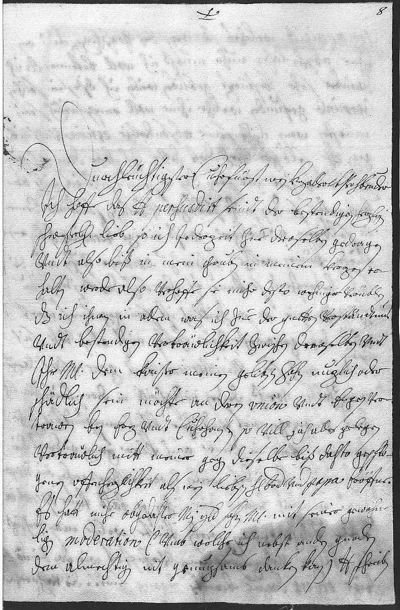 0001Durchleüchtigster Cuhrfürst, mein herzallerlibster herr bruder 0002Ich hoffe, das dero Liebden persuadirt seindt der bestendigen herzligen 0003schwesterlichen lieb, so ich jederzeit zue deroselben gedragen 0004vndt also biß in mein gruben in meinem herzen er- 0005halten werde. Also verhoffe ich, dass sie mihr desto wehniger verüblen, 0006das ich ihnen in allem, was ich zue der guetten verständtnus 0007vndt bestendigen verträwlichkeit zwischen deroselben vndt 0008ihr Mayestät dem Kaißer, meinen gelibsten sohn, nuzlich oder 0009schädlich sein möchte, an deren vnion vndt engen ver- 0010trawen beim erz vndt cuhrhausen so vill, jah alles gelegen, 0011vertrawlich mitt meiner gegen dieselbe biß dahto gepflo- 0012genen offenherzichkeit als mein liebsten herrn bruder vnd papa eröffne. 0013Es hatt mihr obgedachter mein geliebster sohn Mayestät mit seiner gewohn- 0014ligen moderation (vmb welche ich nebst andren gnaden 0015dem almechtigen nit genugsamb danken kan) dero Liebden schreiben
