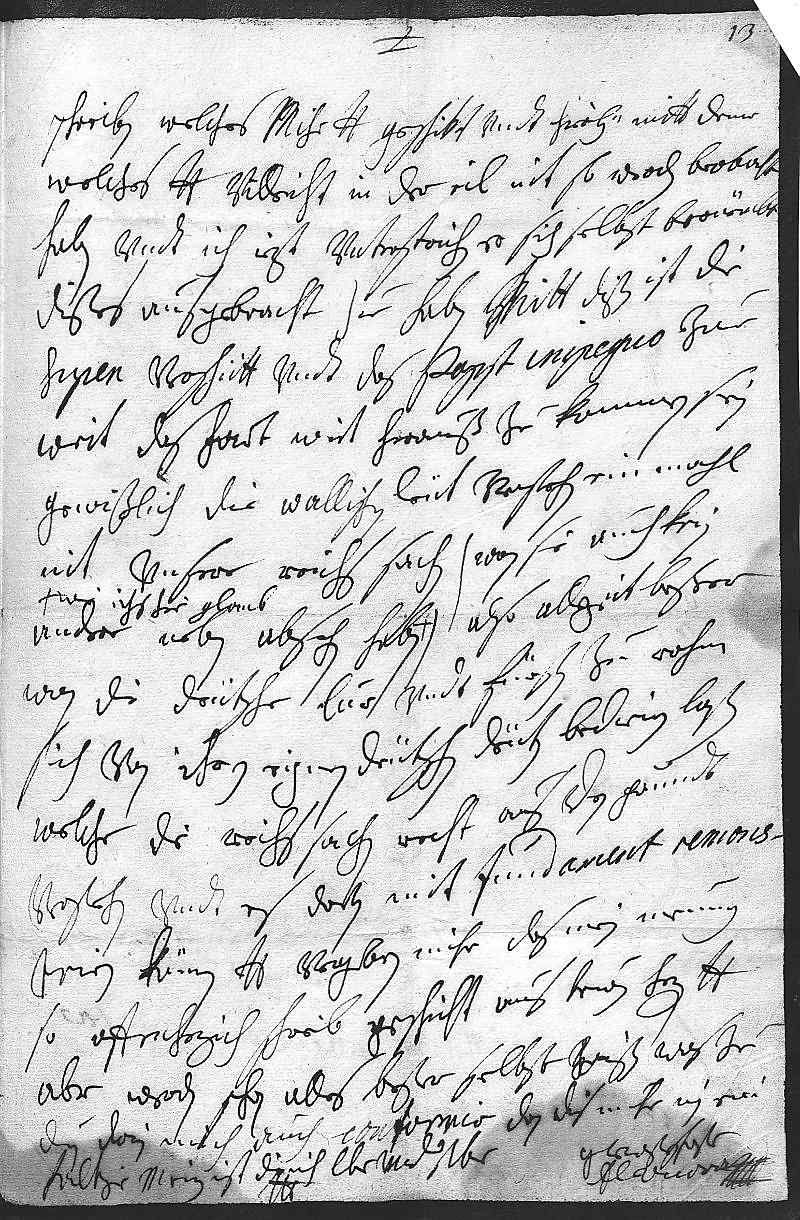 0031schreiben, welches mihr dero Liebden geschikt vndt hierbey mitt deme, 0032welches dero Liebden villeicht in der eil nit so werden beobacht 0033haben vndt ich izt vnterstrichen, er sich selbst berüembt, 0034dißes ausgebracht zue haben. Mitt disen ist die 0035supen verschütt vndt des Papst impegno zue 0036weit, das hart wirt herauß zu kommen sein. 0037Gewißlich, die wallischen leüt verstehn ein mahl 0038nit vnsere reichs sachen (wan sie auch kein 0039andere neben absehen haben, wie ichs hier glaub), also ist es allzeit beßer, 0040wan die deütsche cur vndt fürsten zu Rohm 0041sich von ihren eignen deütschen leüten bedienen lasen, 0042welche die reichs sachen recht aus den grundt 0043verstehn vndt es dorten mit fundament remons- 0044triren könen. Dero Liebden vergeben mihr, das mein meinung 0045so offenherzich schreib, geschicht aus trewen herzen, dero Liebden 0046aber werden schon alles beßer selbst wißen, was zue 0047dun, darin mich auch conformir, dan dis nuhr mein ein- 0048faltige meinung ist, die ich lebe vnd sterbe 0049dero Liebden 0050getrewsteschwester 0051Eleonora