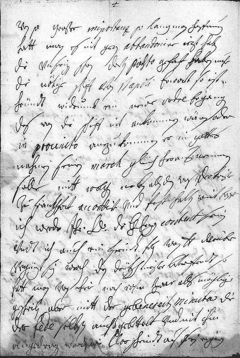 0014von so großer importanz, so lang man hoffnung 0015hatt, man es nit gern abbandonire. Iezt haben 0016die vnsrigen schon dorten posto gefast, haben nuhr 0017die nötige schiff von Napoli erwart, so ist 0018heündt widerumb ein newe ordre ergangen, 0019das, wan die schiff nit ankommen wären oder 0020in procincto anzukommen, er in gottes 0021nahmen seinen march gleich heraus nemmen 0022solle, mitt welchen neben allen den, was der Kaiser 0023zu Frankhfort accordirt vnd fest halten wirt, hoffe 0024ich, werde ihr LIebden, der Großherzog, content sein 0025vndt ich auch ein freüdt haben, wan dero Liebden darüber 0026vergnügt sein werden. Den Deütschmeister betreffendt, so 0027hatt man von hier nach Rohm zwar alls möglige 0028geschriben, aber mitt der gebenedeiten minuta, die 0029der Fedl selbsten auß gebettelt vnd nit ihm 0030angedragen worden, wie clar scheindt aus sein eignen