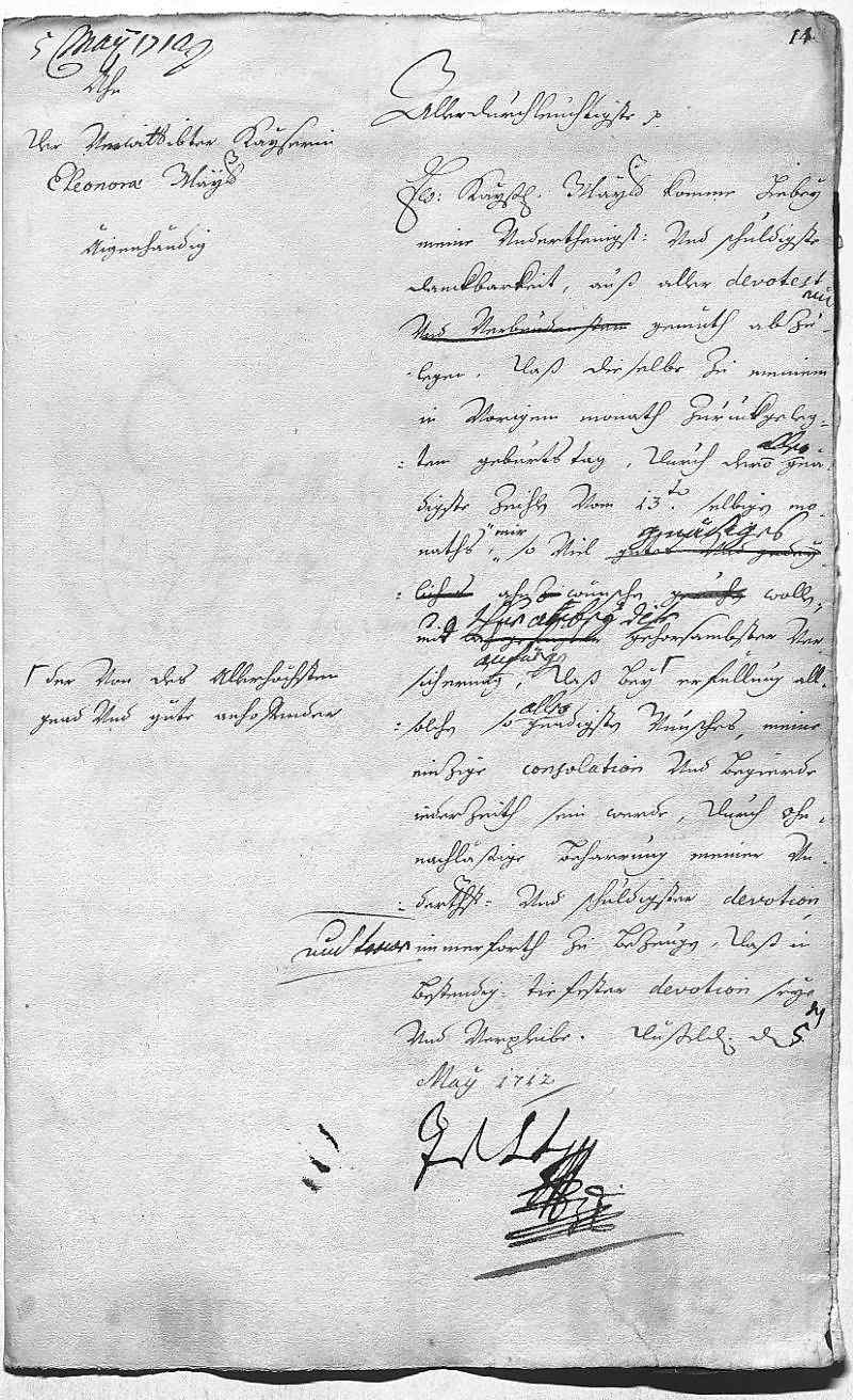 Johann Wilhelm von Pfalz-Neuburg an Eleonora Magdalena von Pfalz-Neuburg, Düsseldorf am 1712.05.05
