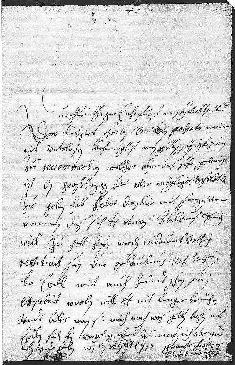 0001Durchleüchtiger Cuhrfürst, mein herzallerlibster herr bruder 0002Dero liebstes schreiben vom 23ten passato werde 0003nit vnterlaßen bestmöglist mein gelibsten sohn, den Kaisern, 0004zu reccommendiren, welcher ohne dies sehr geneicht 0005ist, den Großherzogen Liebden aller möglige consolation 0006zue geben. Hab aber dersider mit schmerzen ver- 0007nommen, das sich dero Liebden etwas übelauf befunden, 0008will zu gott hoffen, sie werden widerumb vollig 0009restituirt sein. Die erlaubnus vohr vnsern 0010bruder Carl wirt auch heündt schon sein 0011expedirt worden. Will dero Liebden nit lenger bemühen 0012vndt bitte, wan sie mich noch was gelten laßen, mit 0013schreiben sich kein vngelegenheit zu machen. Ich aber werd 0014leben vnd sterben 0015ewer Liebden 0016getrewste schwester 0017Eleonora 0018Wien den 16ten novembris 1712