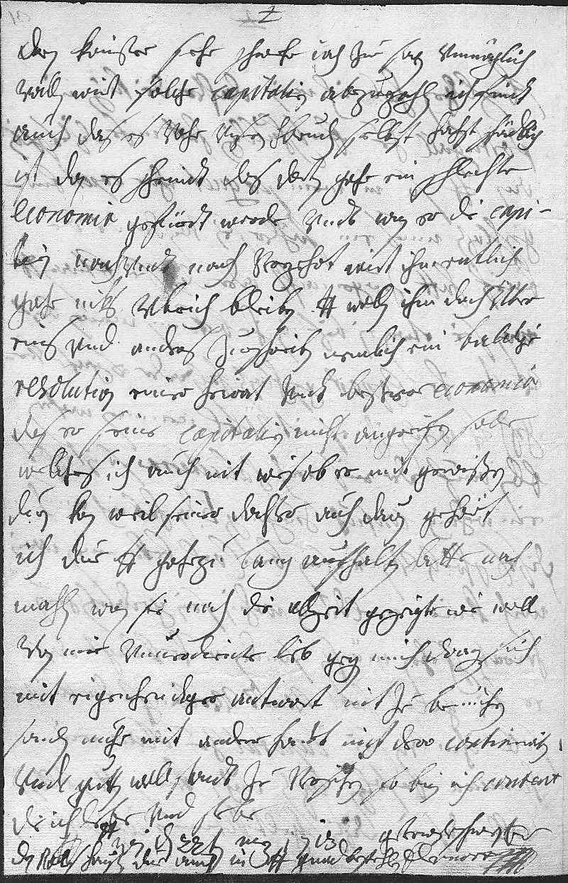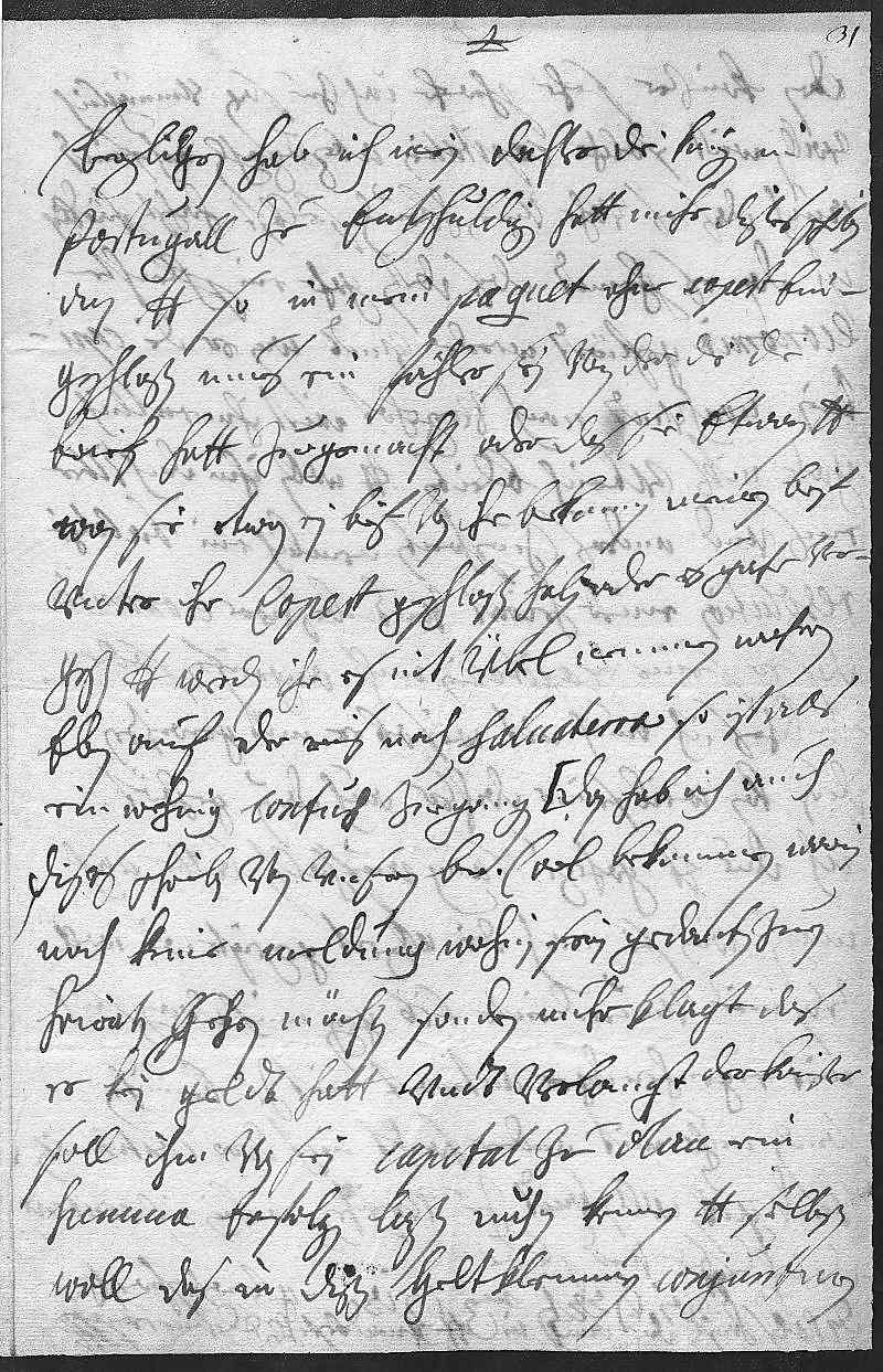 0004begligen hab ich mein dochter, die Konigen in 0005Portugall zue entschuldigen. Hatt mihr dises schreiben 0006an dero Liebden, so in mein paquet ohne copert ein- 0007geschloßen, mues ein fähler sein von der, die die 0008brief hatt zuegemacht, oder das sie etwan dero Liebden, 0009wan sie etwan ein brif von ihr bekomen, meinen brif 0010vnter ihr copert geschloßen haben oder es gahr ver- 0011geßen. Dero Liebden werden ihr es nit übel nemmen, wahren 0012eben auf der reis nach Saluaterra, so ist alls 0013ein wehnig confus zuegangen. Dan hab ich auch 0014dises schreiben von vnsern bruder Carl bekommen, warin 0015noch keine meldung, wohin sein gedanken zum 0016heiraten gehen möchten, sondren nuhr klagt, das 0017er kein geldt hatt vndt verlangt, der Kaißer 0018soll ihm von sein capital zu Olau ein 0019summa erfolgen laßen. Nuhn kennen dero Liebden selbsten 0020woll, das in disen geltklemmen conjuncturen