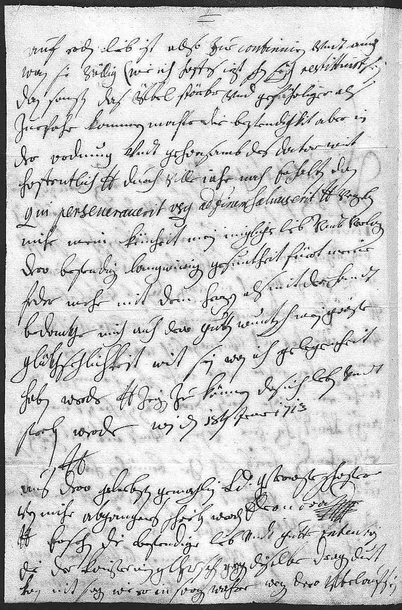 0016auf erden lieb ist, allso zue continuiren, vndt auch, 0017wan sie völlig (wie ich hoff es iezt schon sey) restittuirt sein, 0018dan sonsten das übel stärker vnd gefährliger als 0019zuefohr kommen mochte, die bestendigkeit aber in 0020der ordnung vndt gehorsamb des Doctor wirt 0021hoffentlich dero Liebden durch ville iahr noch erhalten, dan 0022qui perseuerauit usque ad finem saluuserit. Dero Liebden vergeben 0023mihr mein künheit, mein inigliche lieb vndt verlangen 0024dero bestendigen langwirigen gesuntheit füret meine 0025feder mehr mit dem herzen als mit der handt. 0026Bedankhe mich auch dero gutten wuntsch, mein gröste 0027glükhsehlichkeit wirt sein, wan ich gelegenheit 0028haben werde, dero Liebden zeigen zu können, das ich leben vndt 0029sterben werde 0030dero Liebden 0031getrewste schwester 0032Eleonora 0033Wien den 18ten jener 1713 0034Aus dero geliebsten gemahlin Liebden 0035von mihr abgangens schreiben werden 0036dero Liebden ersehen die bestendige lieb vndt gutte intention, 0037die der Kaißer, mein geliebster sohn, gegen diselbe dragen duet, 0038kan nit sagen, wie er in sorgen wahre wegen dero vbelaufsein.