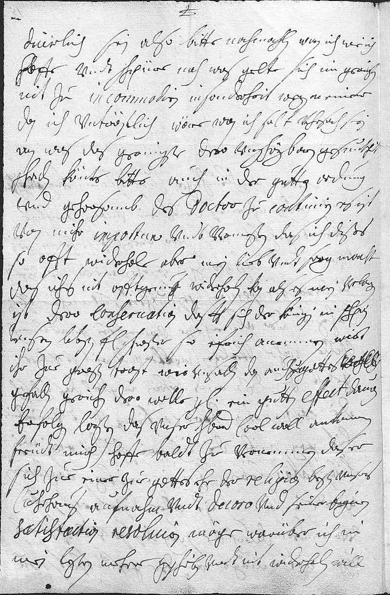 0015dicirlich sein, also bitte nachmahlen, wan ich, wie ich 0016hoffe vndt schpüre, noch was gelte, sich im geringsten 0017nit zu incommodiren, insonderheit wegen meiner, 0018dan ich vntröstlich wäre, wan ich solt vhrsach sein 0019an was, das geringste dero vnschäzbaren gesuntheit 0020schaden könte. Bitte auch, in der gutten ordnung 0021vnd gehorsamb des Doctor zu continuiren. Es ist 0022von mihr importun vndt vermeßen, das ich dißes 0023so offt widerhole, aber mein lieb vndt sorg macht, 0024das ichs nit offtgenug widerholen kan, als es mein verlangen 0025ist, dero conseruation zu sichern. Das dero Liebden sich der Königin in Schpanien, 0026vnßren libsten fraw schwester, so eifrich anemmen, wirt 0027ihr zue großen trost, wie vns allen, dan auch zue gottes gnedig0028gefallen gerichen, dero wolle gnädig ein gutten effect dauon 0029erfolgen laßen. Das vnser herr bruder Carl woll ankommen, 0030freüdt mich, hoffe baldt zue vernemmen, das er 0031sich zue einer zue gottes ehr, der religion besten, vnsers 0032cuhrhaus aufnahm vndt decoro vnd seiner eignen 0033satisfaction resoluiren möge, warüber ich in 0034mein lezten mehrer geschriben vndt nit widerholen will.