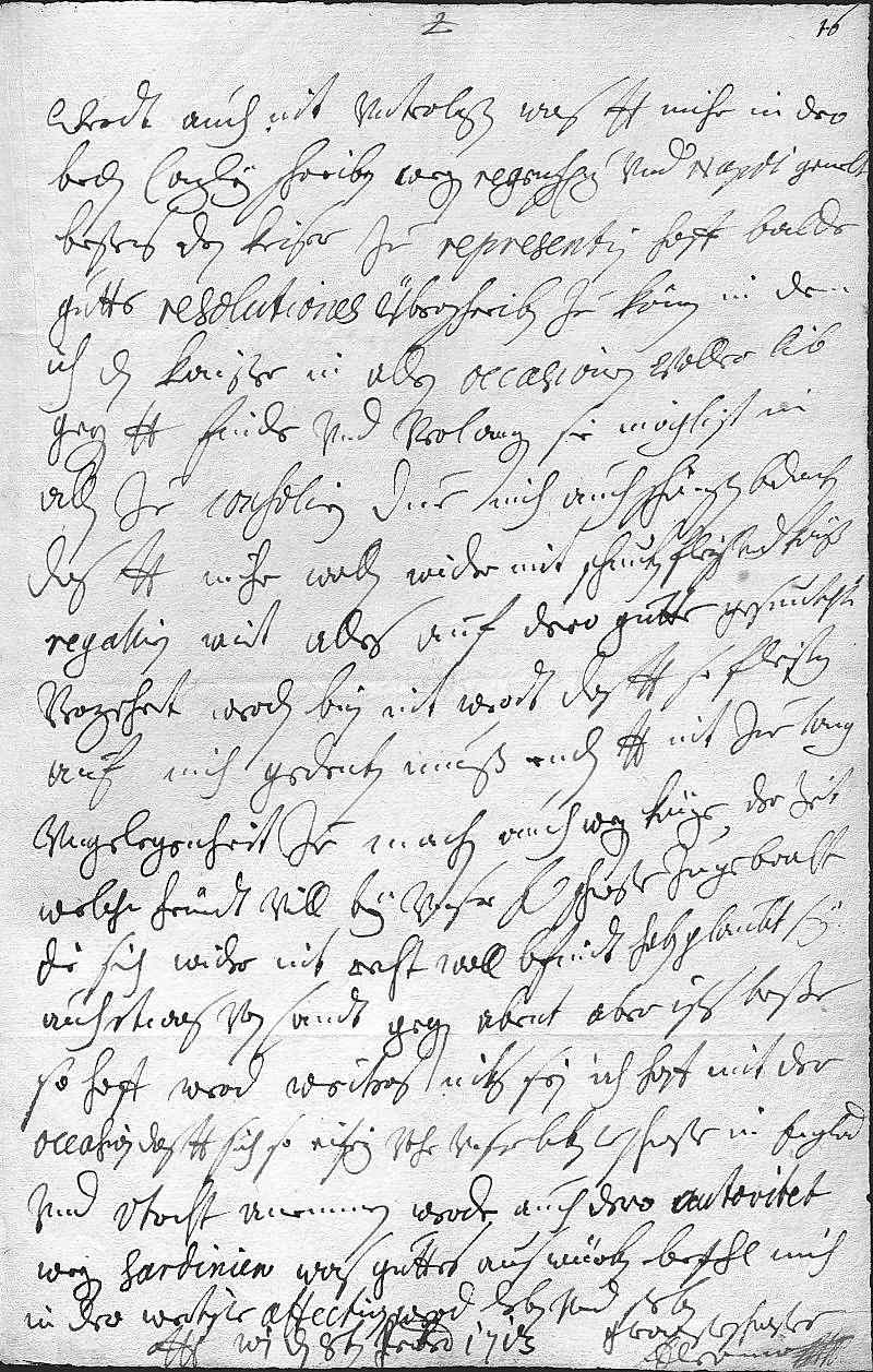 0035Werdt auch nit vnterlaßen, was dero Liebden mihr in dero 0036beden canzley schreiben wegen Regenschpurg vnd Napoli gemelt, 0037bestes den Keiser zu representien, hoff balde 0038gutte resolutiones überschreiben zu können, in dem 0039ich den Kaißer in allen occasionen voller lib 0040gegen dero Liebden finde vnd verlangen, sie möglist in 0041allen zue consoliren. Due mich auch schönsten bedanken, 0042das dero Liebden mihr wollen wider mit schunken, fleisch vnd käß 0043regaliren, wirt alles auf dero gutte gesuntheit 0044verzehrt werden, bin nit werdt, das dero Liebden so fleißig 0045auf mich gedenken. Mueß enden, dero Liebden nit zue lang 0046vngelegenheit zu machen, auch wegen kürze der zeit, 0047welche heündt vill bey vnser fraw schwester zugebracht, 0048die sich wider nit recht woll befindt. Haben glaubt, es sey 0049auch etwas von sandt, gegen abent aber ists beßer, 0050so hoff werd weiters niks sein. Ich hoff, mit der 0051occasion, das dero Liebden sich so eifrig vohr vnser libste schwester in England 0052vnd Vtrecht anemmen, werde auch dero autoritet 0053wegen Sardinien was guttes aus würken. Befehl mich 0054in der wertiste affection, werd leben vnd sterben 0055dero Liebden 0056getrewste schwester 0057Eleonora 0058Wien den 8ten feber 1713