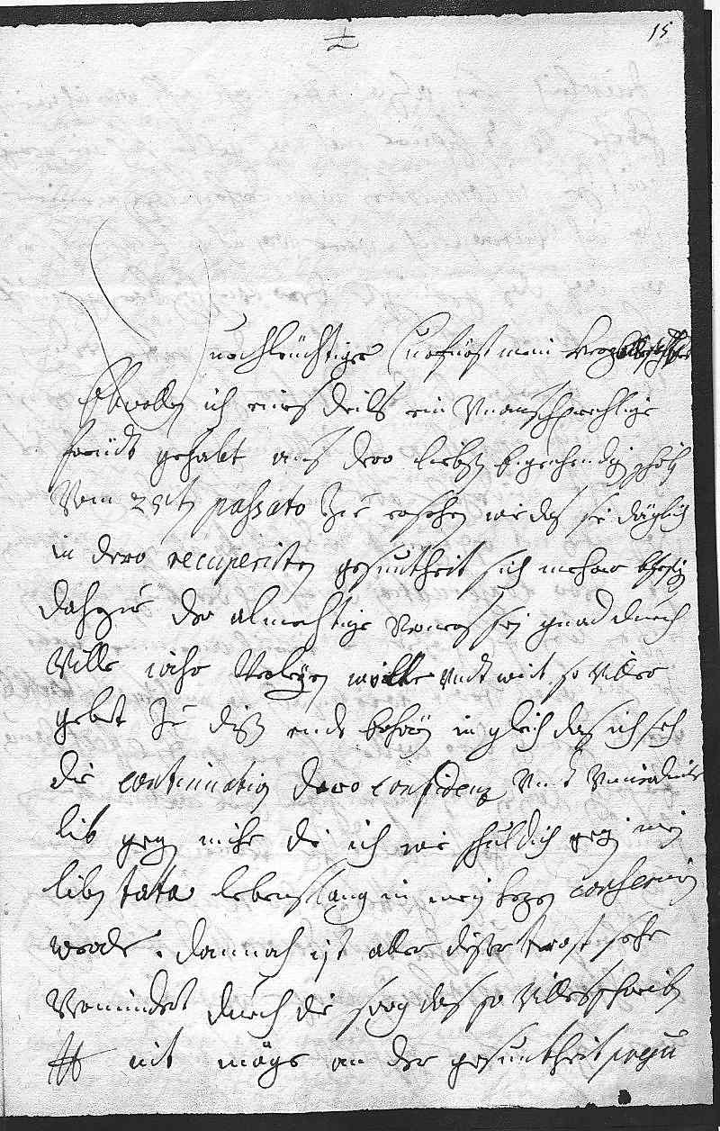 0001Durchleüchtiger Curfürst, mein herzlibster herr bruder 0002Obwollen ich eines deils ein vnauschprechlige 0003freüdt gehabt, aus dero liebsten eigenhendigen schreiben 0004vom 25ten passato zue ersehen, wie das sie däglich 0005in dero recuperirten gesuntheit sich mehrer befestigen, 0006dahzue der almechtige verners sein gnad durch 0007ville iahr verleyen wolle, vndt wirt so viller 0008gebet zu disen ende erhören, in gleich, das ich seh 0009die continuation dero confidenz vndt vnuerdiente 0010lib gegen mihr, die ich, wie schuldich gegen mein 0011liben tata, lebenslang in mein herzen conserviren 0012werde. Dannoch ist aller dißer trost sehr 0013vermindert durch die sorg, das so villes schreiben 0014dero Liebden nit möge an der gesuntheit preju-