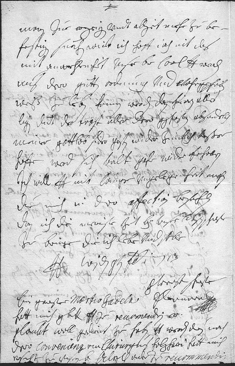 0014man zue erzeigen vndt allzeit mehr zu be- 0015festigen suechen wirt. Ich hoff iah nit, das 0016mit anwesenheit vnser bruder Carl dero Liebden werden 0017aus dero gutten ordnung vnd vohrgeschriben 0018weiß zu leben kommen werden, dan hiran alles 0019ligen dut, der trost aller dero geschwistren, absonderlich 0020meiner. Gottlob, sider gestren geht es unserer schwester wider zimlich beßer, 0021hoffe, werd sich balt gahr wider erholen. 0022Ich will dero Liebden nit länger vngelegenheit machen, 0023due mich in dero affection befehlen, 0024dan ich die meriste zeit bey vnser libsten schwester 0025zue bringe, die lich lebe vnd sterbe 0026dero Liebden 0027getrewste schwester 0028Eleonora 0029Wien den 9ten februarii 1713 0030Ein gewißer Martio Gadela 0031hatt mich gebetten, dero Liebden zue reccomendirn, er 0032glaubt, woll gedient zue haben, dero Liebden werden duen nach 0033dero convenienz. Ein chirurgus Holzhari hatt mich 0034ersucht, ihn zu vnsern bruder Alexander zu reccommendiren,